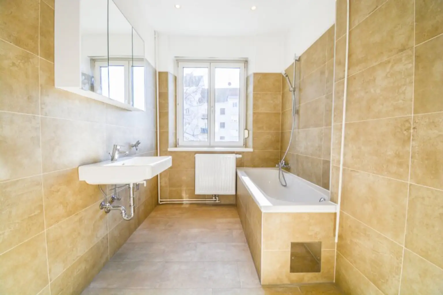 Das Badezimmer bietet ein angenehmes Raumgefühl dank natürlicher Belichtung – ausgestattet mit Badewanne, Waschbecken und Waschmaschinenanschluss.