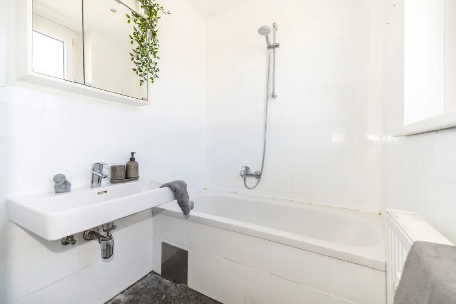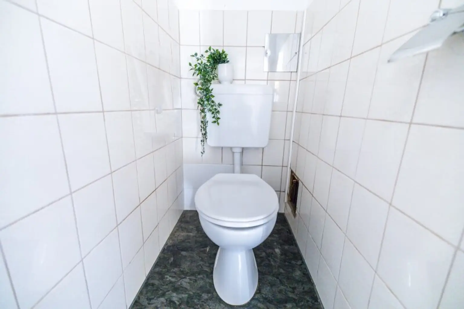 Das Badezimmer ist hell und freundlich gestaltet und verfügt über eine Badewanne, ein Waschbecken und einen Spiegelschrank. Ein großes Fenster sorgt dafür, dass Sie auch hier von natürlichem Licht profitieren. Die Toilette ist separat und über den Vorraum erreichbar, was zusätzliche Privatsphäre bietet. Praktischerweise befindet sich der Waschmaschinenanschluss im Abstellraum.