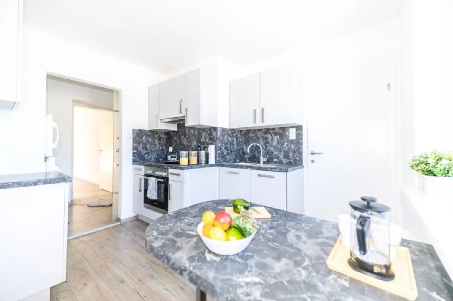 * Komplett ausgestattete Designerküche: Hochwertige Geräte und ein durchdachtes Design machen Kochen zum Vergnügen.