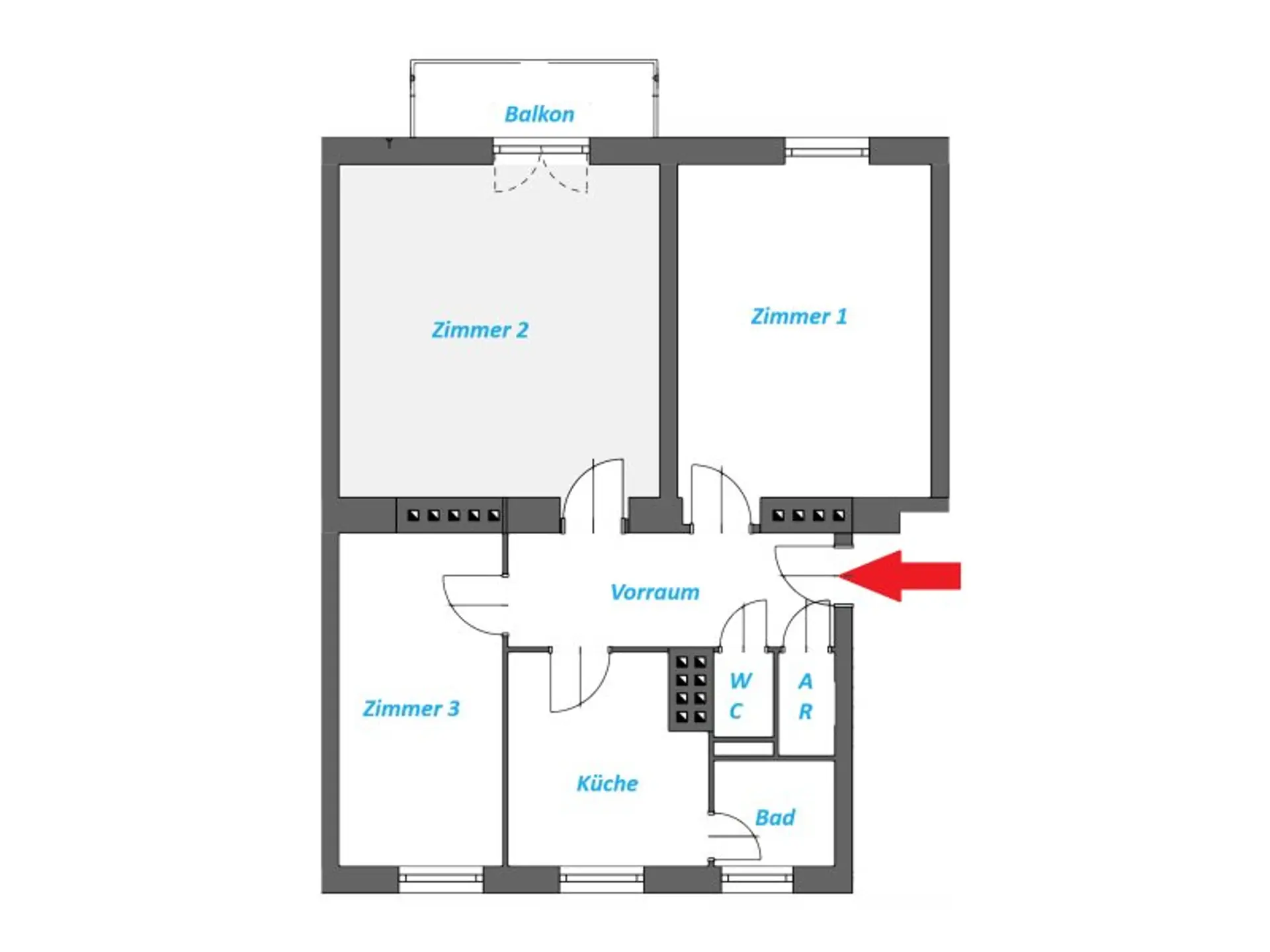 * Flexibles Raumkonzept: Drei separat begehbare Zimmer, die Ihnen maximale Gestaltungsfreiheit für Ihre Wohnbedürfnisse ermöglichen.