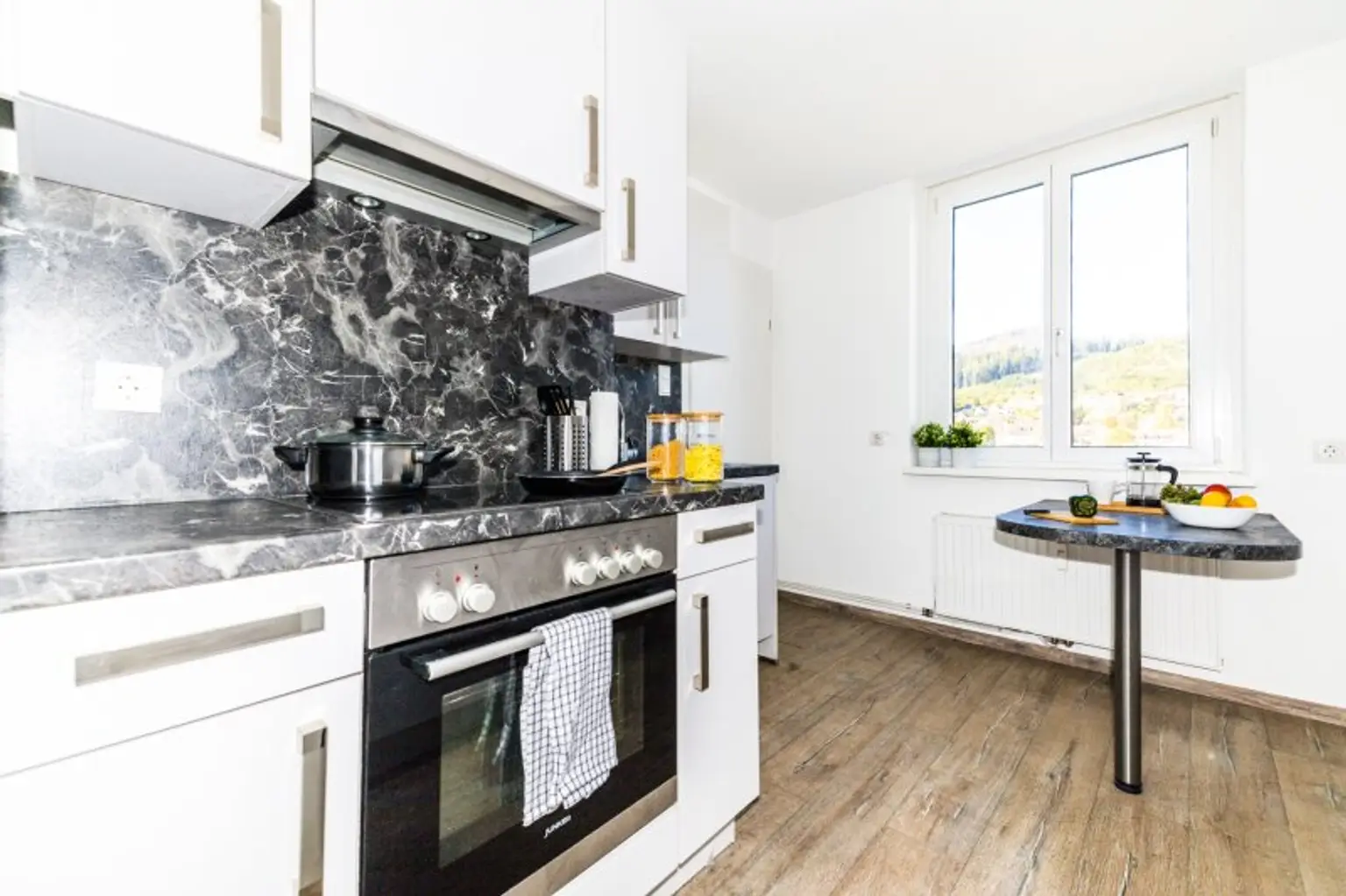 Durch eine elegante Glasschiebetür gelangen Sie in die moderne Küche, die keine Wünsche offenlässt. Sie ist nicht nur optisch ein Genuss, sondern auch praktisch bestens ausgestattet. Mit Kühlschrank, Gefrierschrank, Backrohr, Ceranfeld, Geschirrspüler und viel Stauraum sind Sie für jede kulinarische Herausforderung gerüstet. Ein Esstisch, der sich perfekt in das Küchendesign einfügt, lädt zu gemeinsamen Mahlzeiten ein. Dank des großen Fensters ist die Küche tagsüber lichtdurchflutet und bietet eine angenehme Atmosphäre.