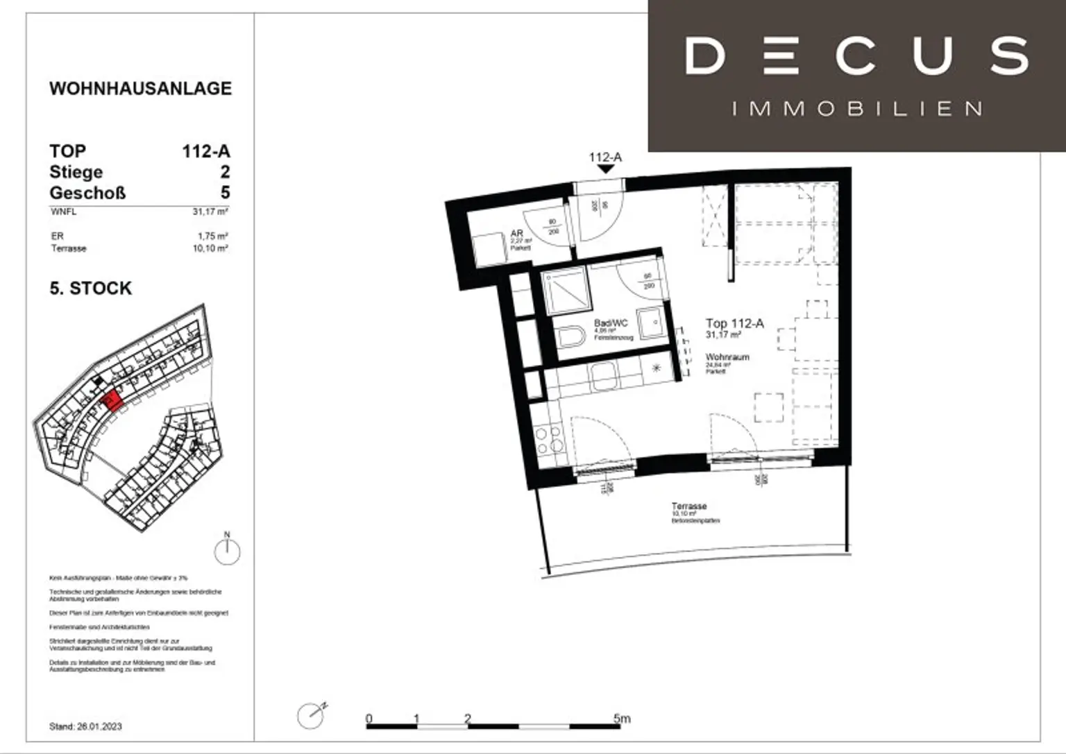 Die Wohnung im Bauteil 2 Top 112 befindet sich im 5. Obergeschoß, ist südostseitig ausgerichtet und teilt sich wie folgt auf: