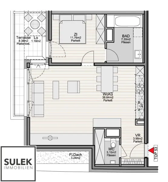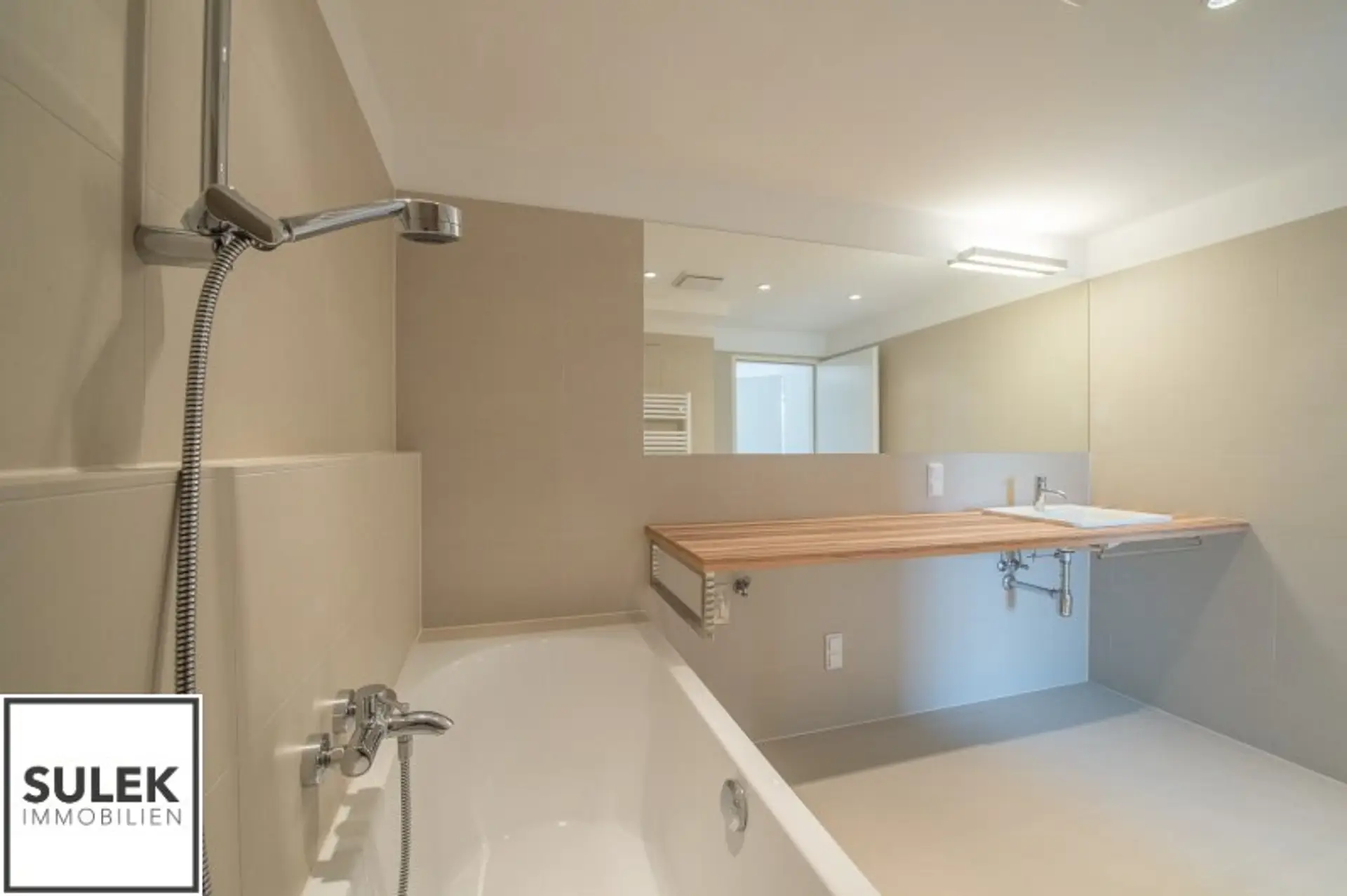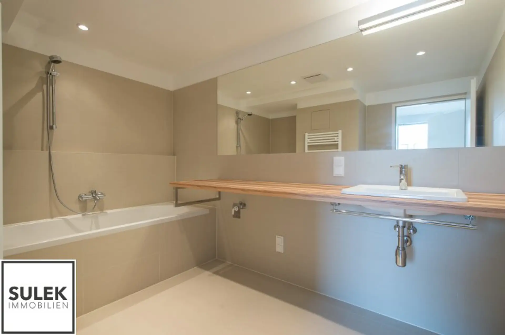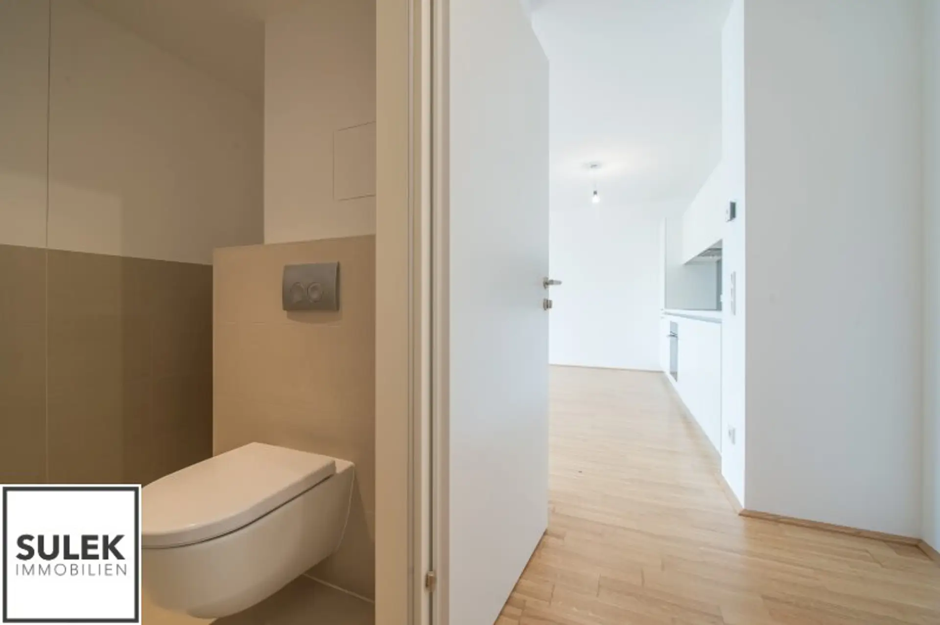 Die Wohnung besteht aus einem großen Vorraum der genügend Platz für Schrank und Kommode bietet, einer offenen Wohn-Küche mit hochwertigen Miele-Geräten, einer offenen Loggia, einem hellen Schlafzimmer, ein Badezimmer mit Wanne und einem edlen Waschbecken. Beide Zimmer sind zum Innenhof hin ausgerichtet. Sowohl das erste Schlafzimmer als auch das sehr offen gestaltete Wohn- und Esszimmer mit Ausgang auf die 8m2 große Terrasse ist sehr freundlich und lichtdurchflutet. Das Badezimmer wird mit den hochwertigen Materialien auch höchsten Ansprüchen gerecht. Das separate WC erreichen Sie vom Vorraum aus!