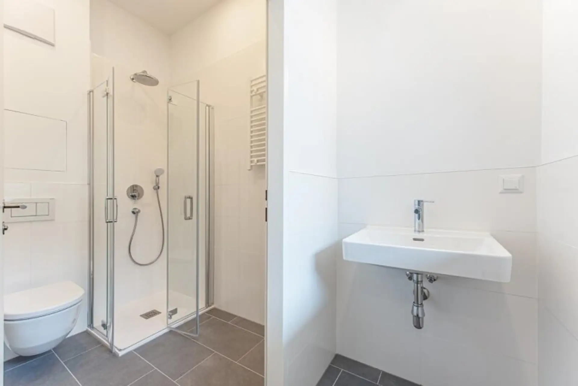 - Badezimmer mit Dusche, WC und Waschmaschinenanschluss