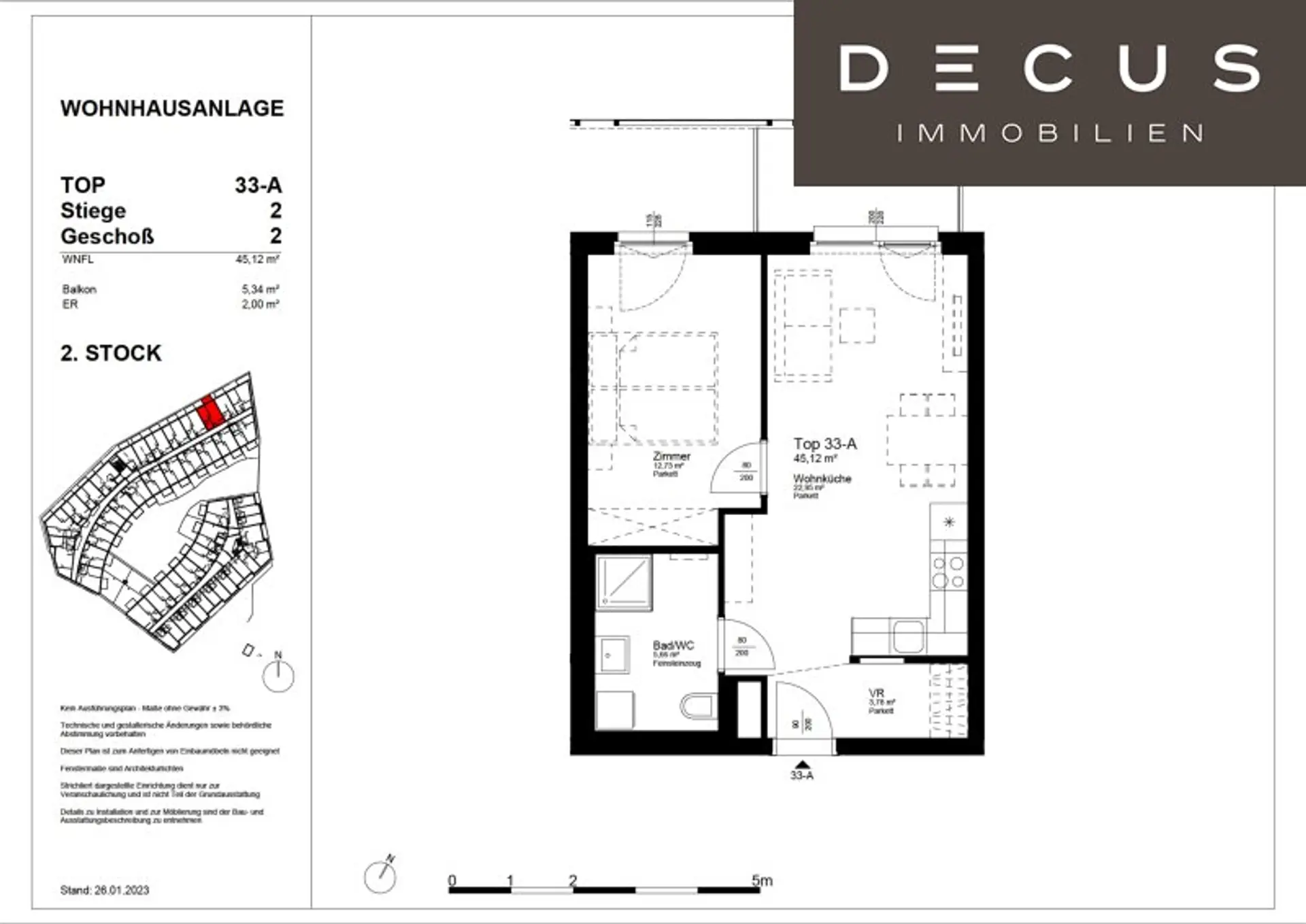 Die Wohnung im Bauteil 2 Top 33 befindet sich im 2. Obergeschoß, ist nordwestseitig ausgerichtet und teilt sich wie folgt auf: