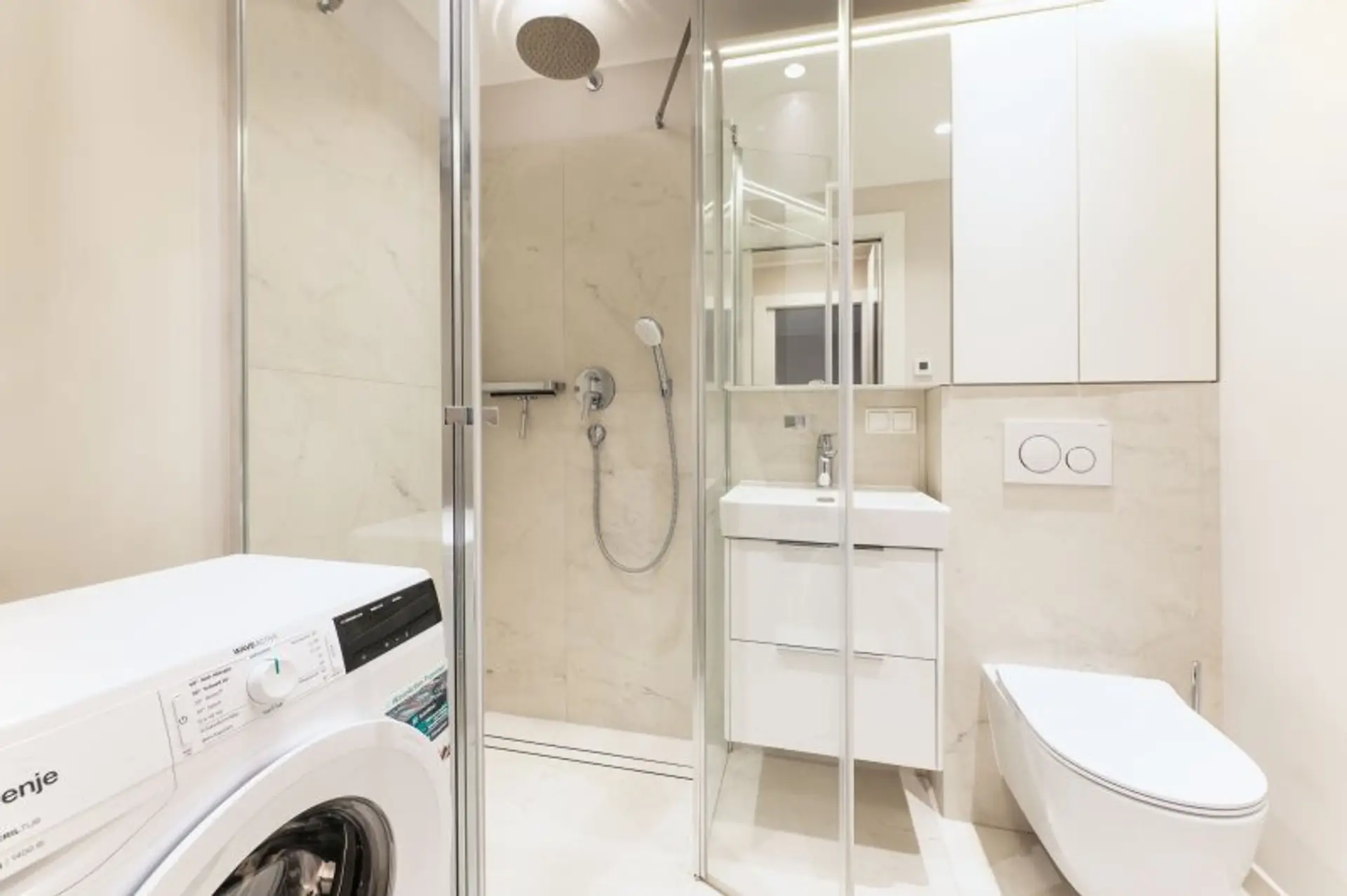 - Badezimmer mit Dusche, WC und Waschmaschine