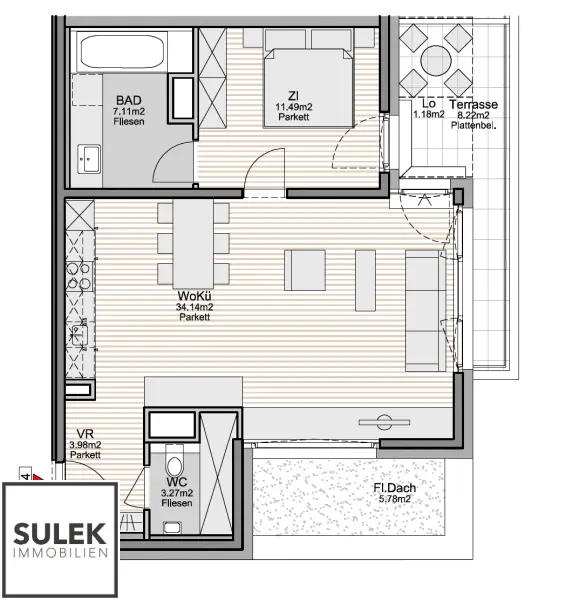 Die Wohnung besteht aus einem großen Vorraum der genügend Platz für Schrank und Kommode bietet, einer offenen Wohn-Küche mit hochwertigen Miele-Geräten, einer offenen Loggia, ein Schlafzimmer mit Zugang zum Badezimmer, welches mit einer Badewanne und einem Waschplatz samt Spiegel ausgestattet ist.