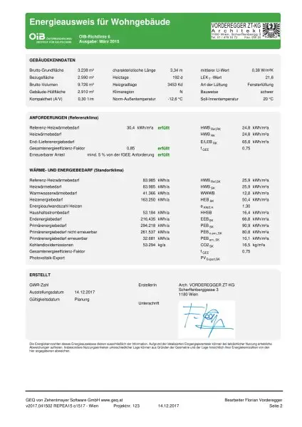 Der Heizwärmebedarf beträgt 24,80 kWh/m2a, welcher der Klasse B entspricht.