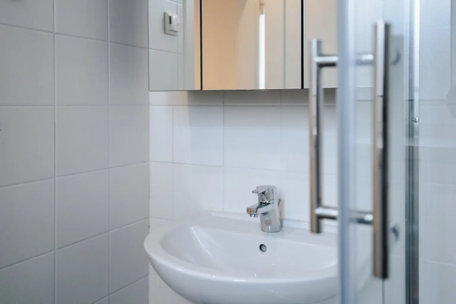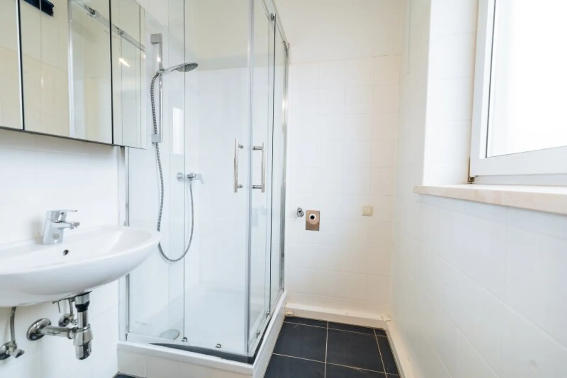 * Elegantes Badezimmer: Ausgestattet mit einer Eckdusche, Waschbecken mit Spiegelschrank und einem Waschmaschinenanschluss, präsentiert sich das Bad in einem modernen Schwarz-Weiß-Design.