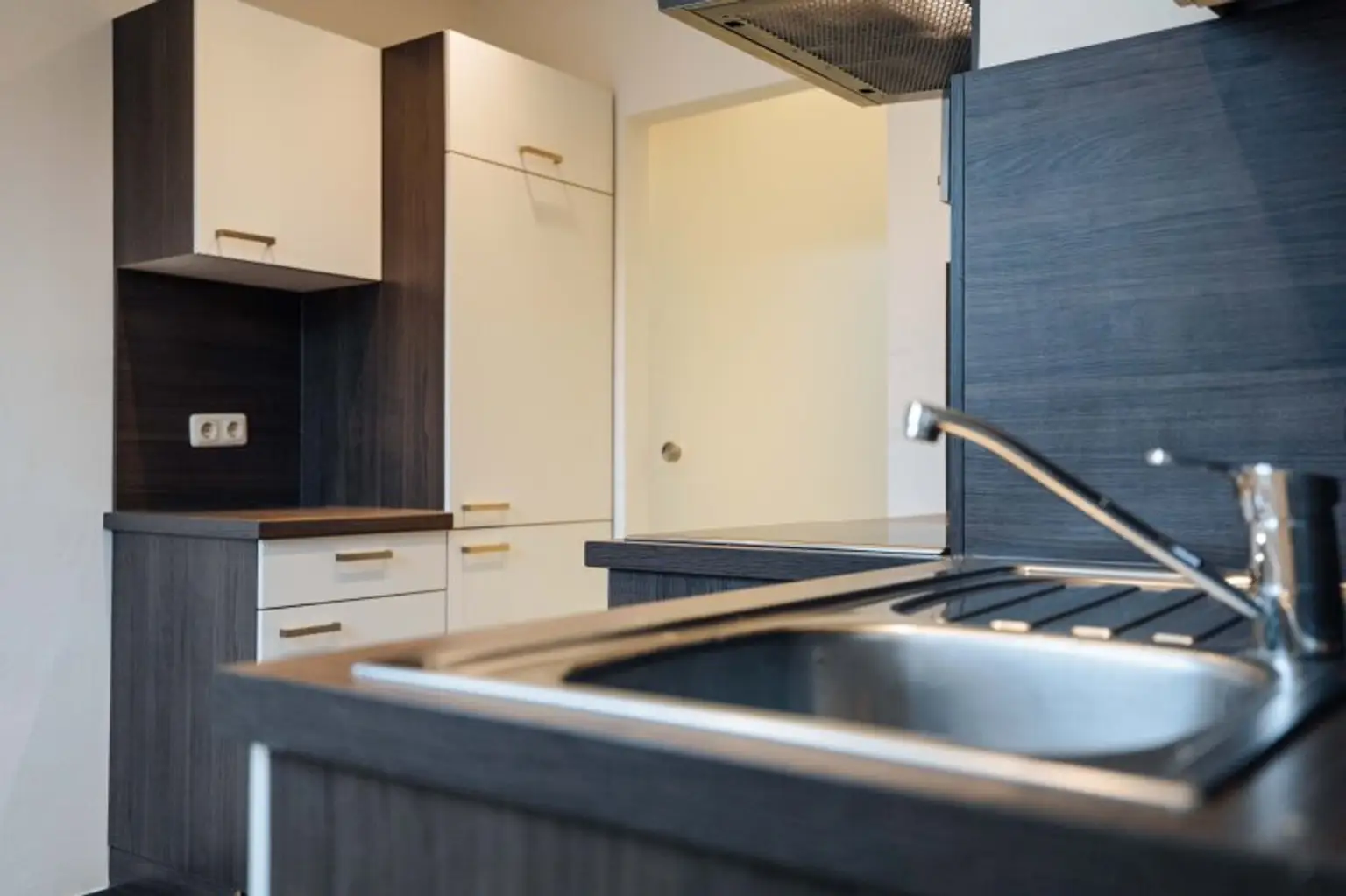 Die Glas-Schiebetür offenbart eine vollausgestattete, moderne Küche, die nicht nur durch ihre Ausstattung, sondern auch durch die optimale Beleuchtung und die gemütlichen Sitz- und Essmöglichkeiten überzeugt. Hier werden Kochen und gesellige Abende zum wahren Vergnügen. Das elegante Badezimmer mit Eckdusche, Waschbecken mit Spiegelschrank und einem praktischen Waschmaschinenanschluss fügt sich nahtlos in das moderne Gesamtbild ein.