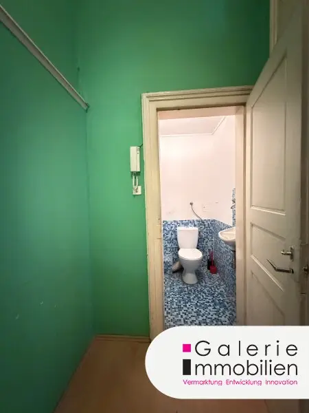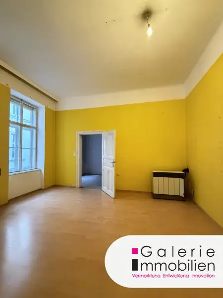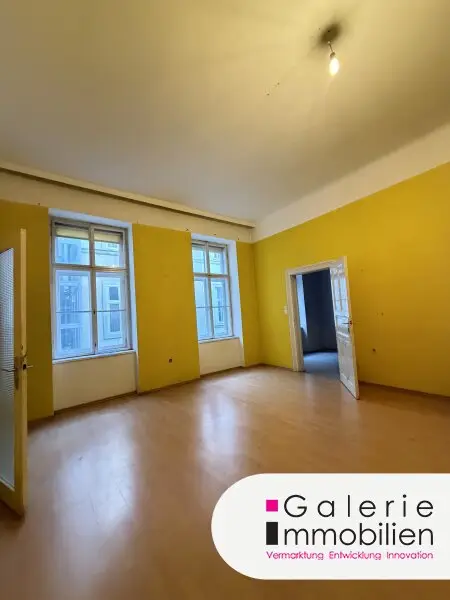 Die süd-ostseitige, helle, hofseitig ausgerichtete und damit absolut ruhige Wohnung verfügt auf 49,32m² großer Wohnfläche über ein Wohnzimmer und ein Schlafzimmer, das vom Wohnzimmer aus begehbar ist, weiters über eine Küche mit Fenster und den Anschlüssen und über eine separate Toilette mit Fenster und Waschbecken. Die Raumhöhe beträgt 3.50m. Die Wohnung muss komplett saniert werden, Bodenbeläge und Elektrik sind zu erneuern, Fenster sind herzurichten, eine Heizung muss installiert werden, Naßräume müssen hergerichtet bzw. erneuert werden. Derzeit hat die Wohnung keine Liftberechtigung. Liftbeteiligungkosten liegen einmalig bei ca. €5.000,-. Monatliche Liftkosten betragen €0,49/m² +10%USt.