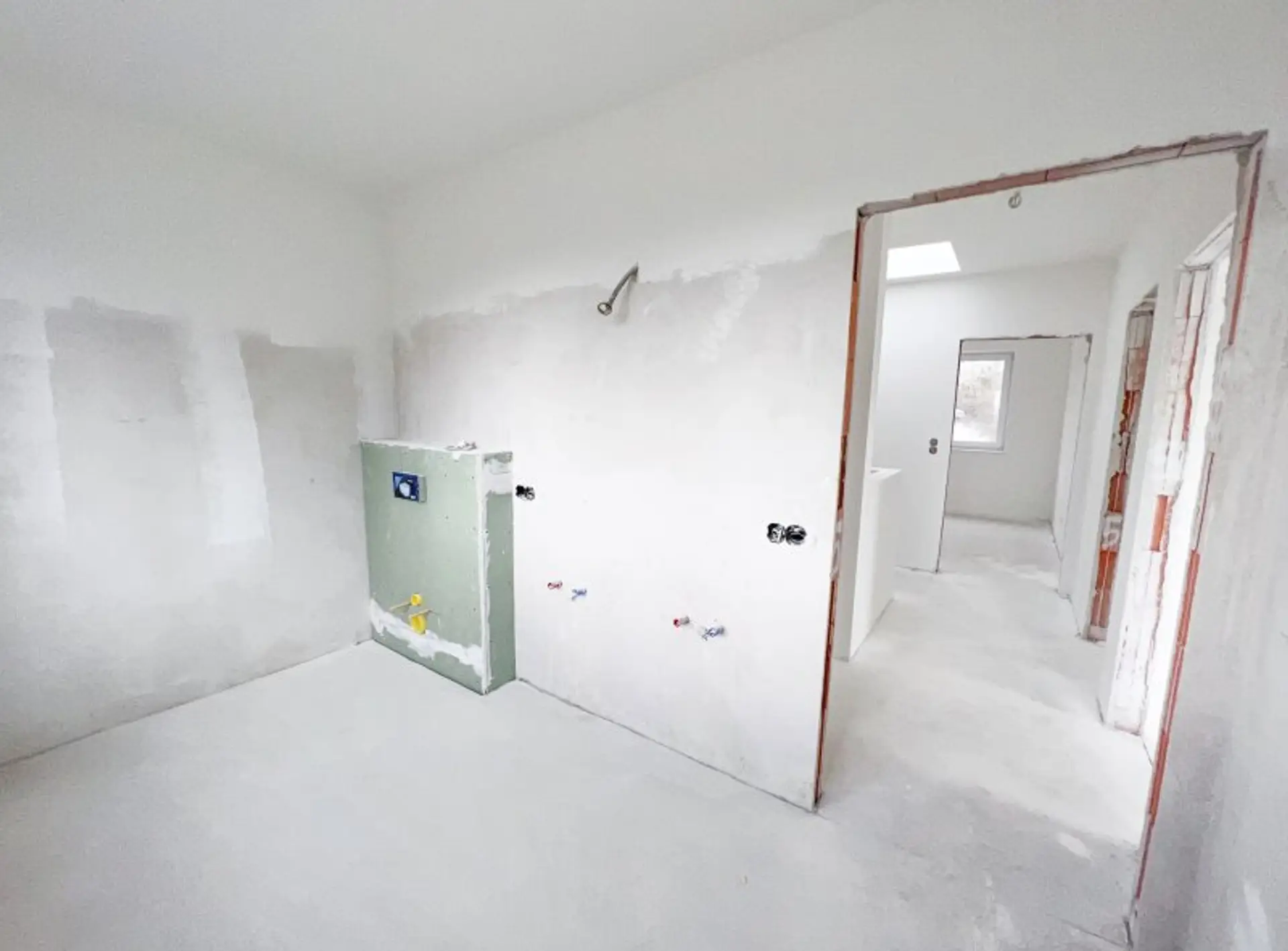 - ein geräumiges Badezimmer mit Vorbereitungen für Dusche und Badewanne und WC