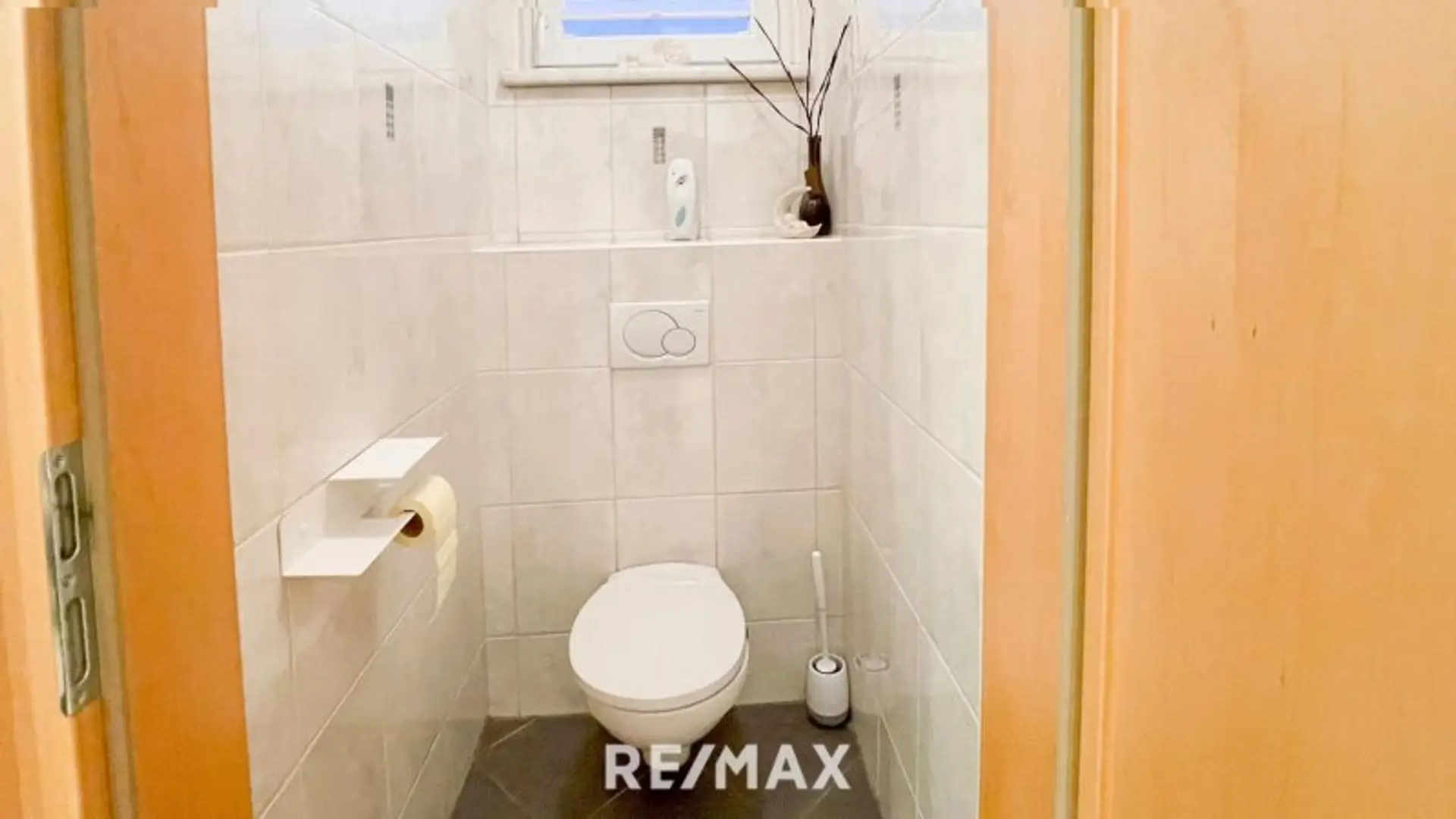 zentraler Vorraum mit Zugang zu Wohnraum und extra Toilette mit Handwaschbecken