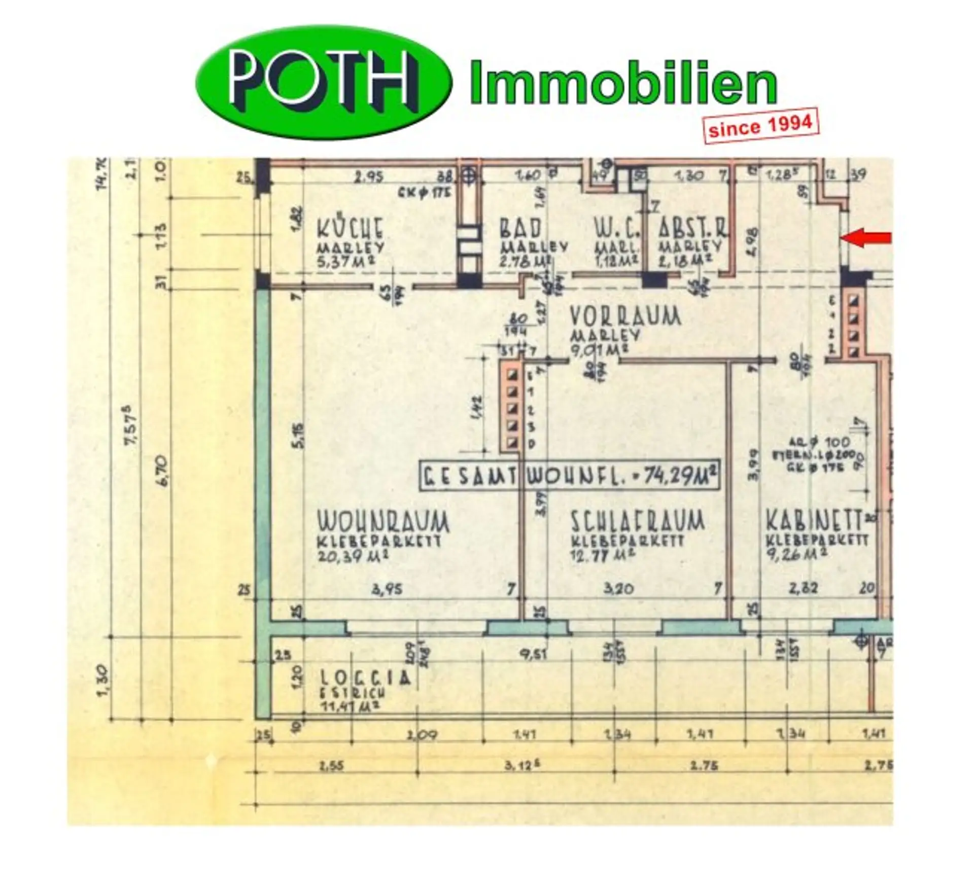 Vorzimmer: 9,01m², Wohnzimmer: 20,39m², Küche: 5,37m², Schlafzimmer: 12,77m², Kabinett: 9,26m², Badezimmer/ WC: 3,90m², Abstellraum: 2,18m², Loggia: 11,41m² daraus ergibt sich eine Gesamtfläche von 74,29m²