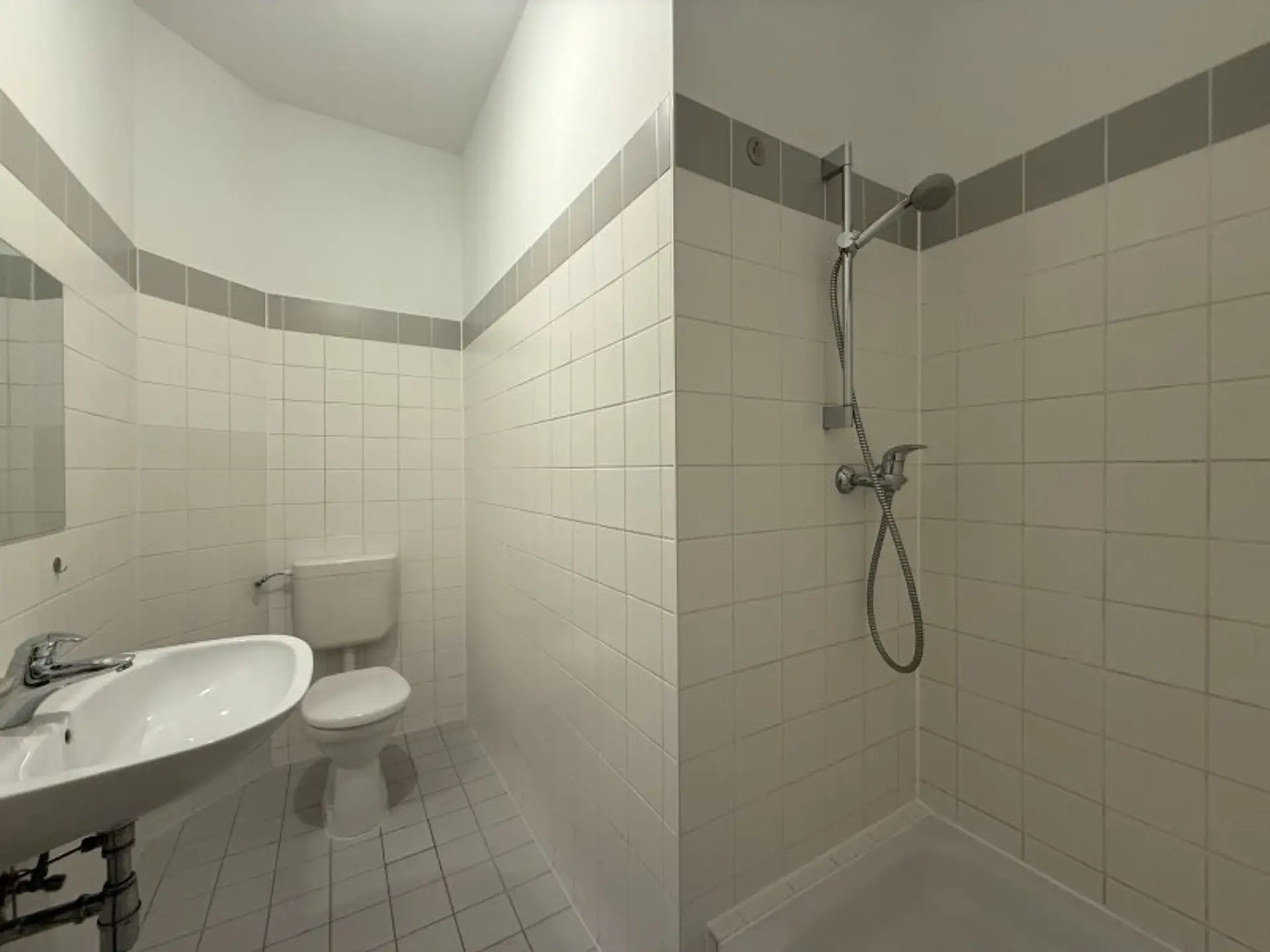 Badezimmer – mit Dusche, Waschbecken und Waschmaschinenanschluss