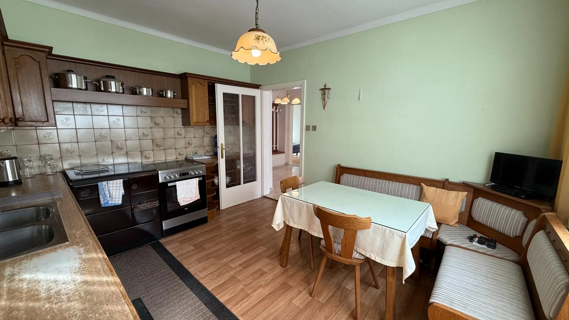 geräumige Küche mit Holzofen und angrenzender Speis