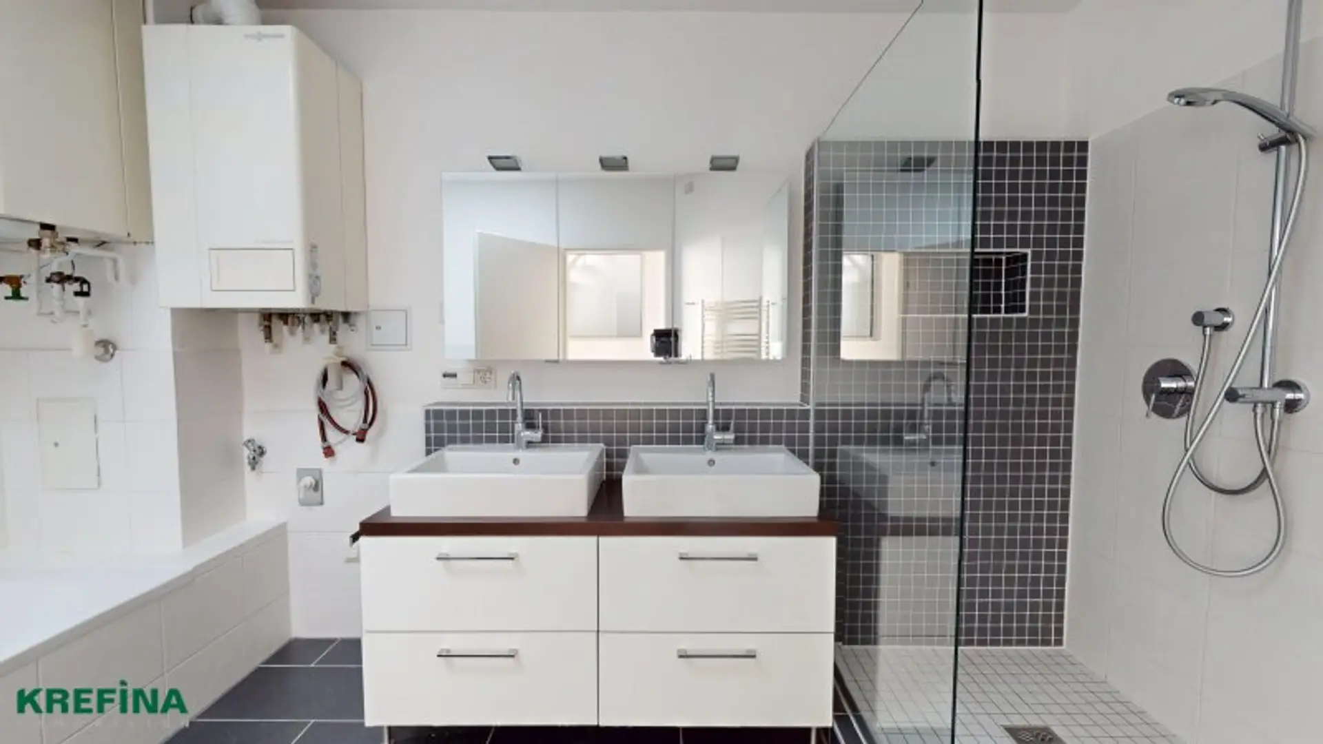 + Bad mit großzügiger Dusche und Regenbrause, Badewanne, Waschmaschinenanschluss