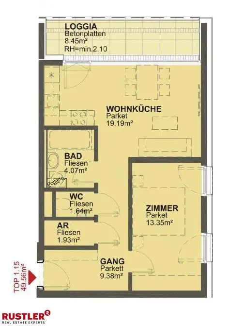 Zwischen Marchfeldkanal, dem Bisamberg und der beliebten Stammersdorfer Kellergasse mit seinen Heurigen gelegen, befindet sich dieses Projekt zum Wohlfühlen im 21. Wiener Gemeindebezirk. Man ist umgeben von reichlich Grün und inmitten von Naherholungsgebieten, wodurch reichlich Freiraum für Entspannung und Erholung geboten wird. Vom Bisamberg aus ist der Blick auf die Stadt und den Donauraum einmalig. Die Landschaft ist Lebensraum für viele bemerkenswerte Tiere und Pflanzenarten und erlaubt zudem den traumhaften Ausblick auf unvergleichliche Sonnenuntergänge. Genießen Sie die Vorzüge des Stadtlebens, gepaart mit Ruhe und wunderschöner Natur! Die zeitlose Architektur des Gebäudes fügt sich harmonisch ins Umfeld ein. Die Erschließung aller 65 Wohnungen erfolgt über zwei Stiegenhäuser samt Aufzügen. Alle Wohneinheiten verfügen über unterschiedliche Freiflächen, wie Eigengärten, Terrassen, bzw. Loggien. Im Kellergeschoss ist die Errichtung einer Tiefgarage mit 63 PKW-Stellplätzen vorgesehen, zudem befinden sich dort auch die Technik- und Einlagerungsräume, sowie Fahrradabstellplätze. Ein zusätzlicher Kinderwagenabstellraum ist im Erdgeschoss vorgesehen. Ausstattung: • Vollwärmeschutzfassade mit hervorragender Energieeffizienz • Eichenparkettböden in allen Wohn- und Schlafräumen • Fußbodenheizung mit Raumthermostat • Heizung- und Warmwasser komfortabel über Fernwärme • Qualitativ hochwertige Armaturen • Außenliegender Sonnenschutz bei den Fenstern • Kabel-TV / Internet Anschluss • Wohnungseingangstüren mit Einbruchsschutz (WK II bzw. RC2) • Einlagerungsraum für jede Wohnung • Kinderwagenabstellplätze im EG • Fahrradabstellplätze im UG Der PKW-Stellplatz in der hauseigenen Tiefgarage kostet € 85,20 und kommt zu den monatlichen Gesamtkosten hinzu. Idyllische Gassen, Weinberge und traditionelle Heurige warten auf Genießer. Ein schönes Ausflugsziel in der näheren Umgebung bietet der Bisamberg. Lassen Sie den Alltagsstress zu Hause und entspannen Sie zwischen den Weinreben mit einem herrlichen Blick über Wien. Erledigungen des täglichen Bedarfs können großteils zu Fuß erledigt werden. Der Autobus ist nur eine Minute entfernt, die Straßenbahn in Gehweite stellt die Direktverbindung zur U-Bahn-Linie U6 dar. Somit kann man die Vorzüge des ländlichen Stadtrands genießen und erreicht dennoch gemütlich die Wiener Innenstadt. Ein Shopping-Vergnügen bietet das G3 Shopping Resort Gerasdorf, wo einkaufen wohlfühlen ist, sowie das Shopping Center Nord inklusive Kino-Erlebnis.