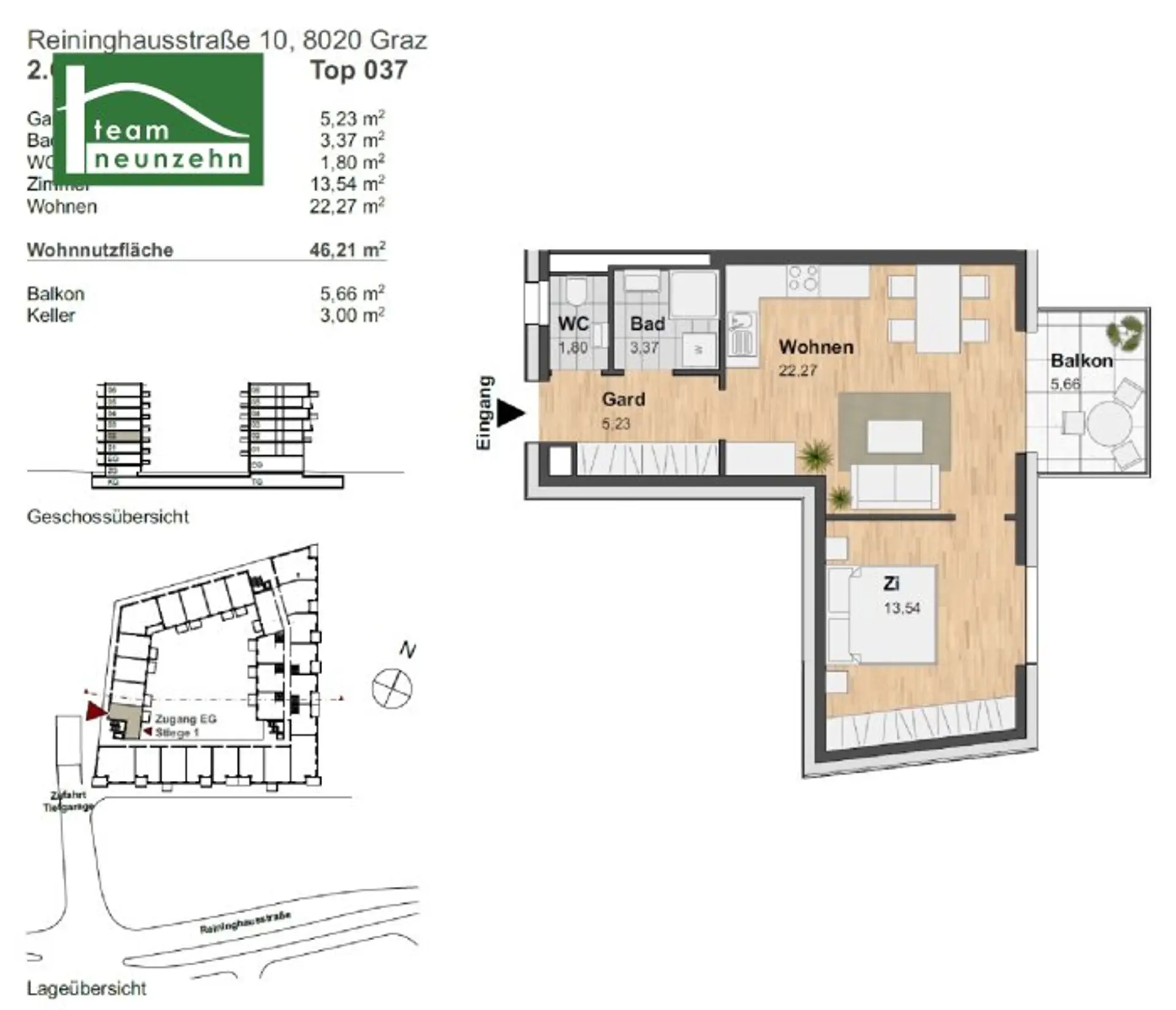Die 2-Zimmer-Wohnung mit ca. 46,21 m² Wohnfläche und ca. 5,66 m² Balkon befindet sich im 2. Obergeschoss und gliedert sich in folgende Raumaufteilung: