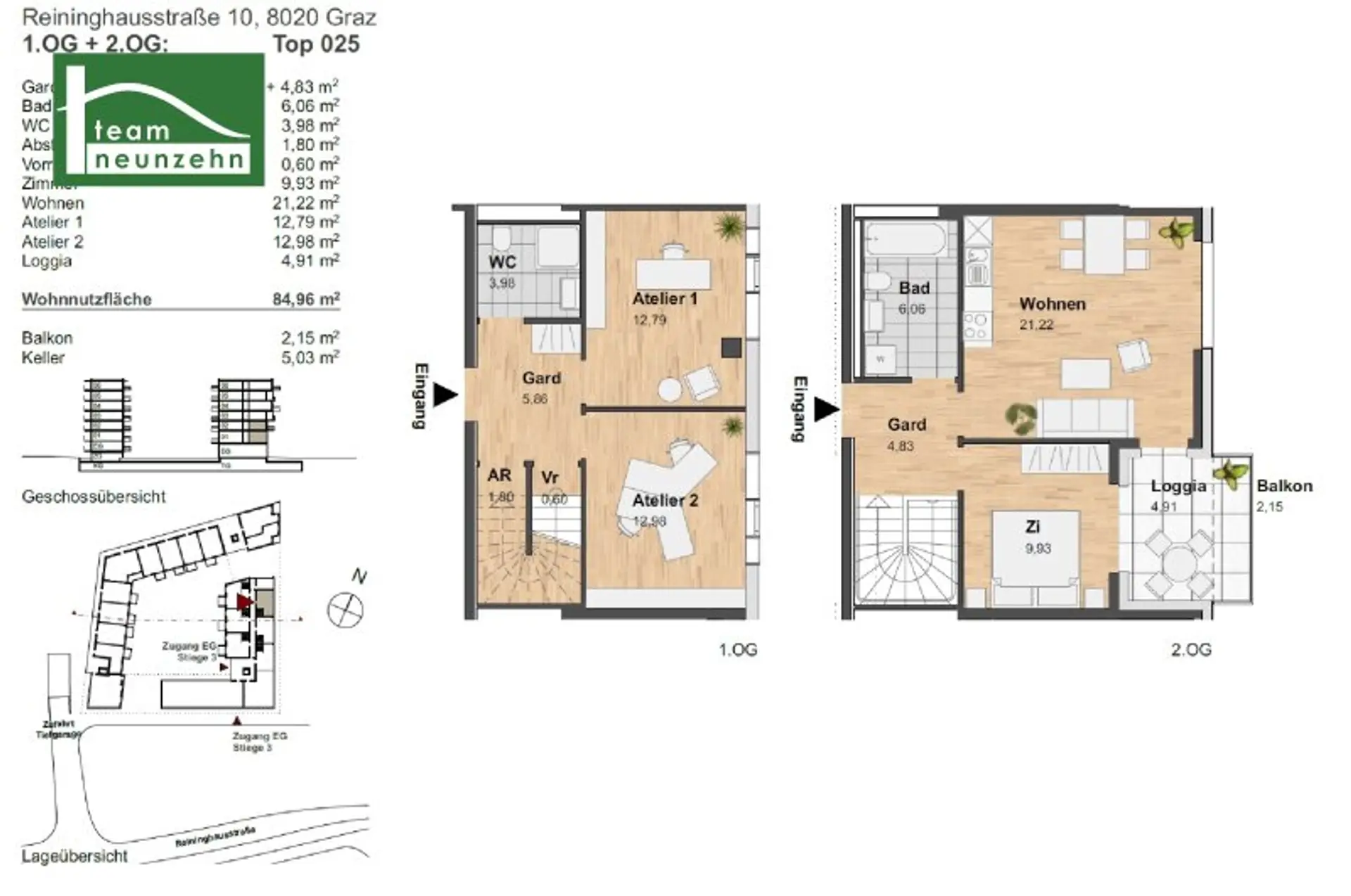 Die 4-Zimmer-Wohnung mit ca. 80,05 m² Wohnfläche zzgl. ca. 4,91 m² Loggia & ca. 2,15 m² Balkon befindet sich im 1. & 2. Obergeschoss und gliedert sich in folgende Raumaufteilung: