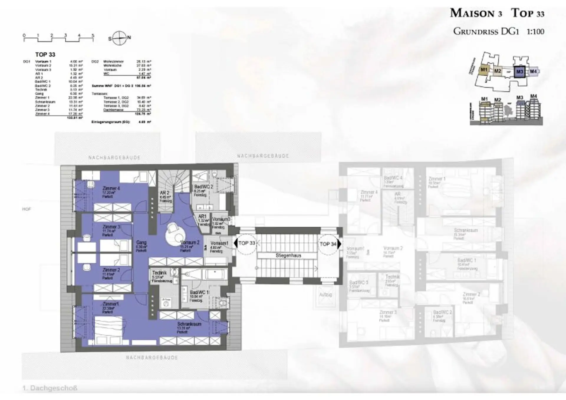 2. Dachgeschoss: Wohnküche (27,03 m²), Wohnzimmer (26,13 m²) mit Zugang zu 3 Terrassen (53,51 m²), Vorraum und Gäste-WC