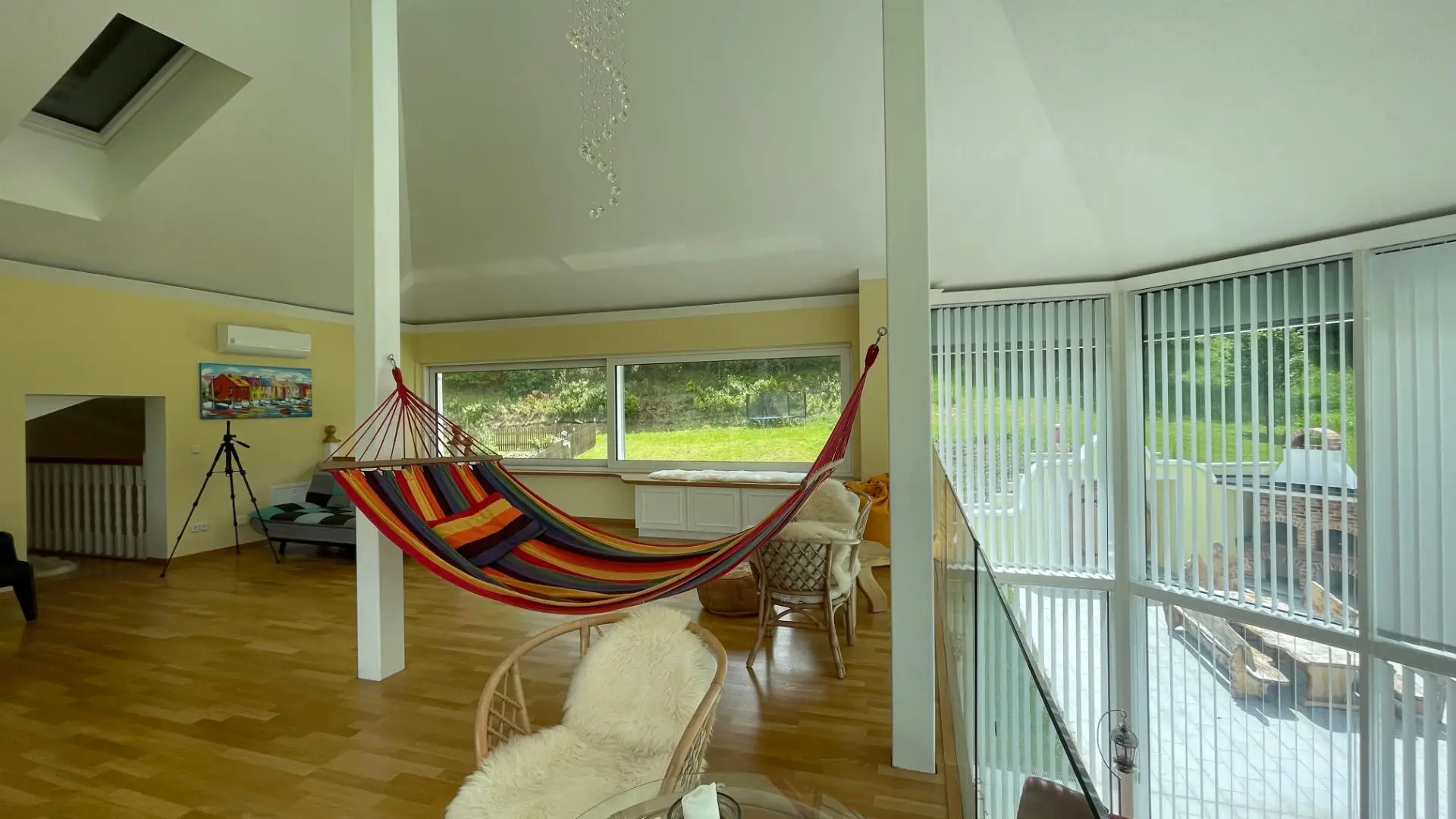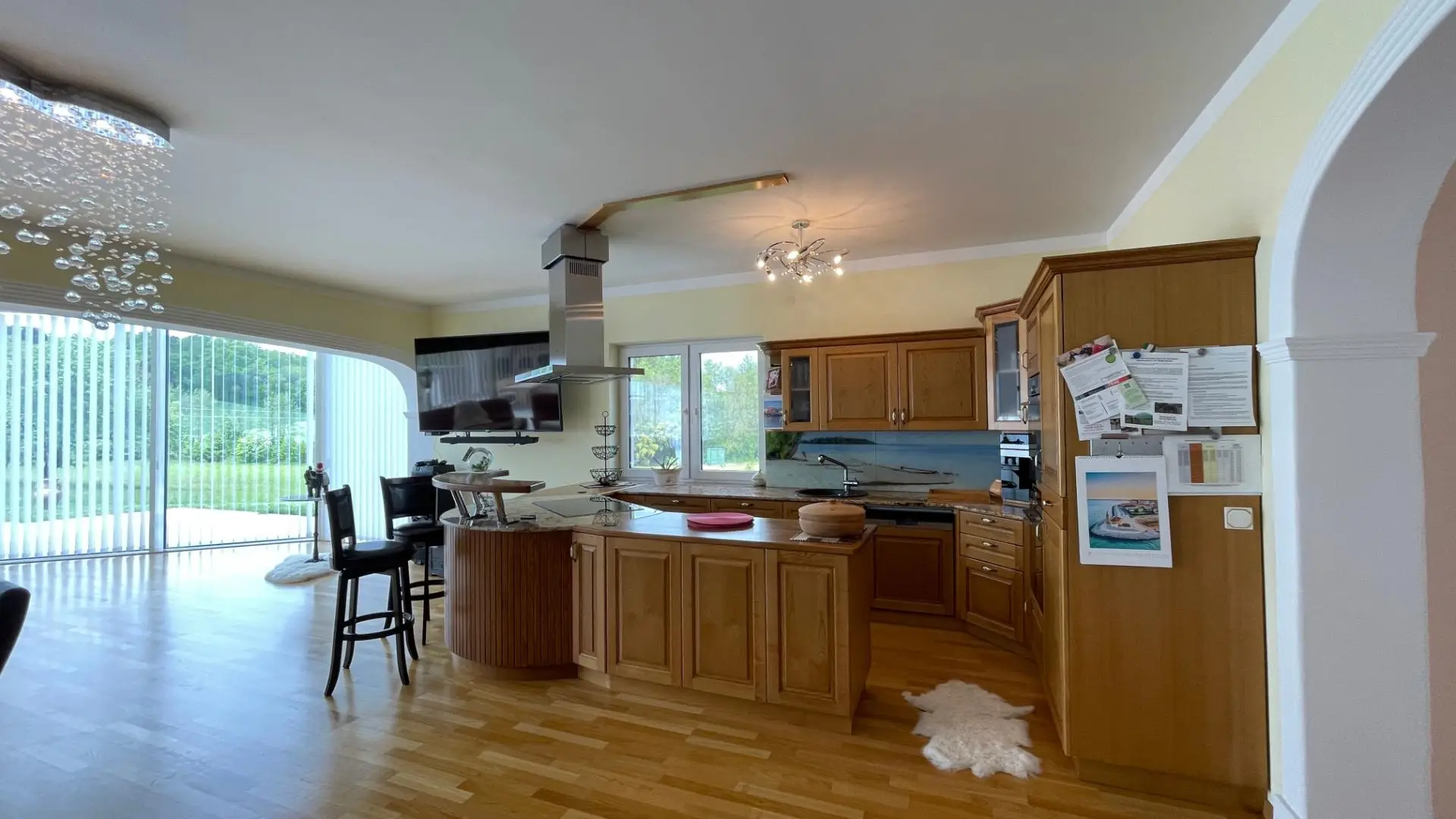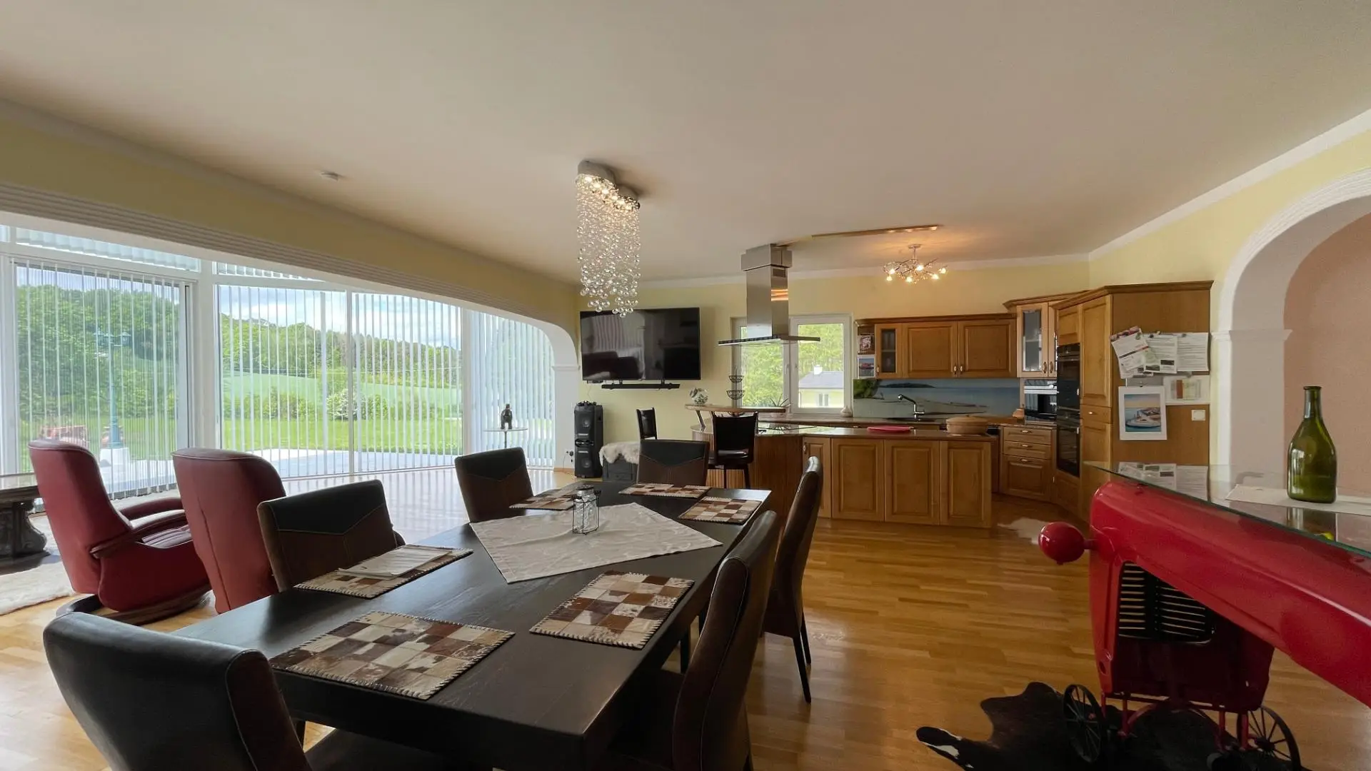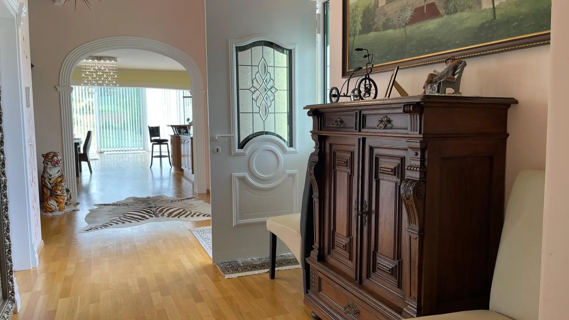 Ihre Gäste residieren völlig autark in einem eigenen Wohnbereich mit Schlafzimmer und Bad. Das angeschlossene, ca. 89 m² große Glashaus ist ein architektonisches Highlight und bietet den idealen Rahmen für Feste oder die Umgestaltung in eine Indoor-Pool-Landschaft.