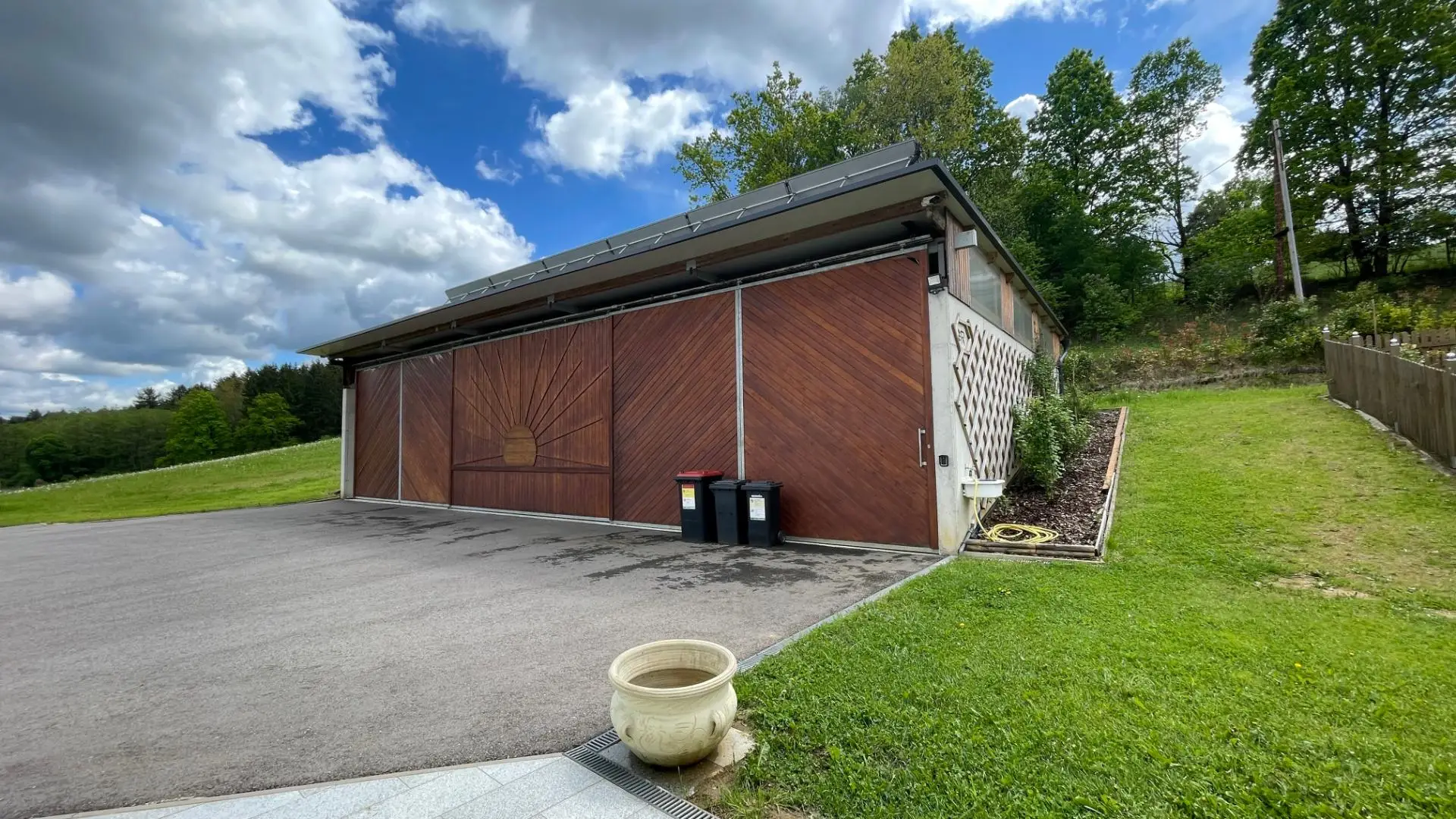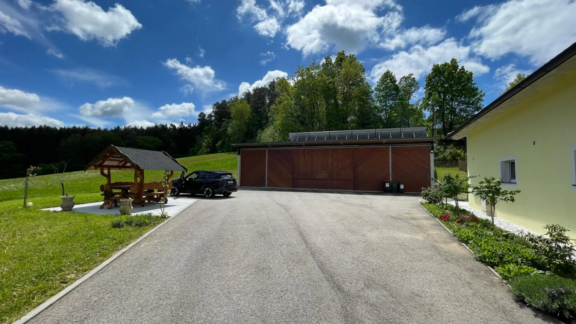 Hobby & Fuhrpark: Ca. 180 m² großes Nebengebäude mit drei elektrischen Schiebetoren – ideal für Sammler oder als Werkstatt.