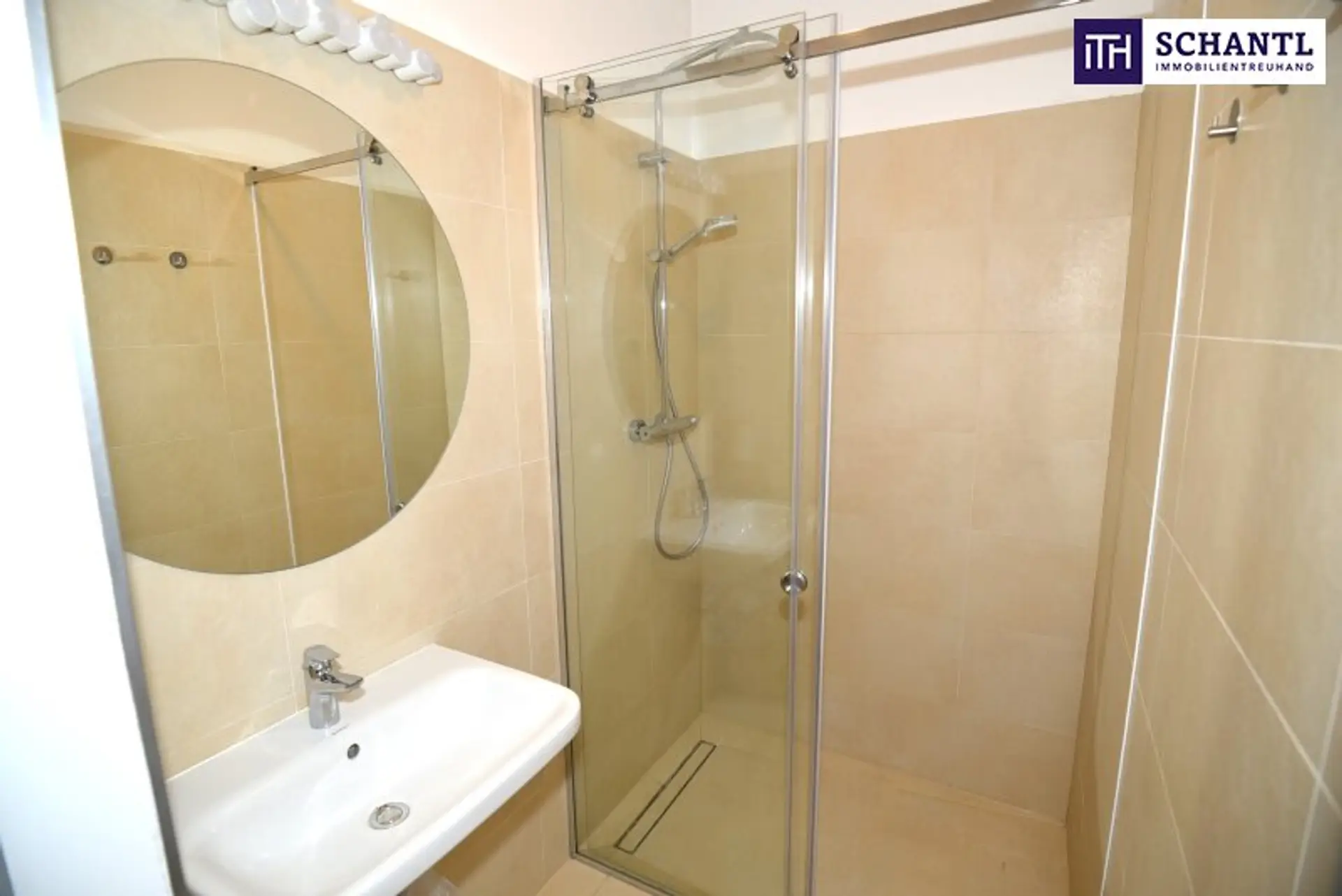 Das moderne Badezimmer verfügt über eine komfortable, barrierefreie Dusche, ein separates WC sorgt für zusätzlichen Komfort.