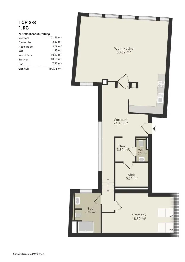 Neben dem Wohnsalon bietet die Wohnung ein Schlafzimmer, das sich ruhig zur Rückseite orientiert. Ergänzt wird der Grundriss durch ein Badezimmer mit Glasdusche, ein separates WC, eine Garderobe sowie einen praktischen Abstellraum – kompakt organisiert und durchdacht auf einer Ebene.