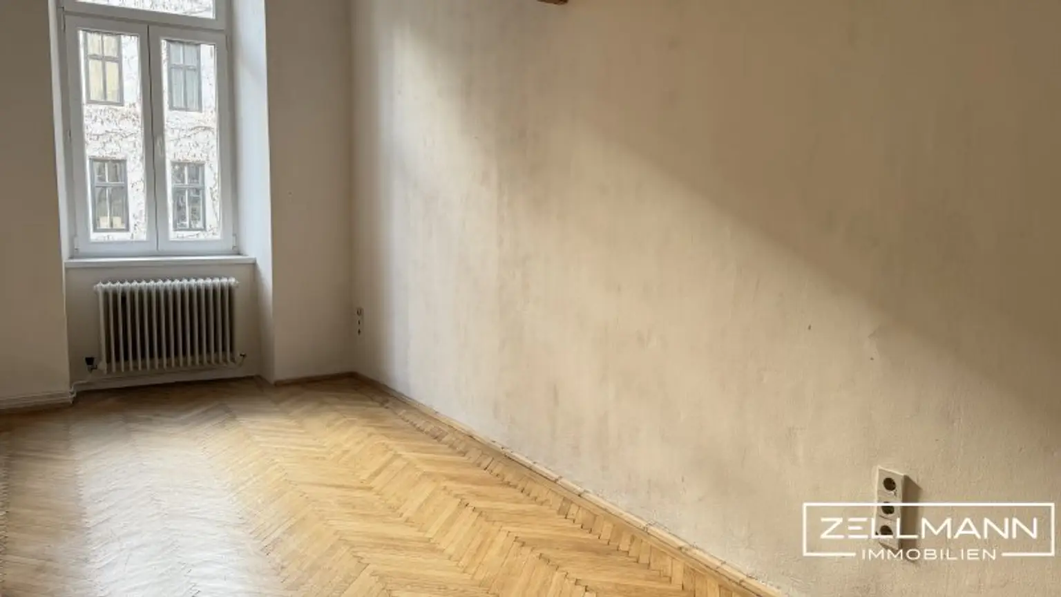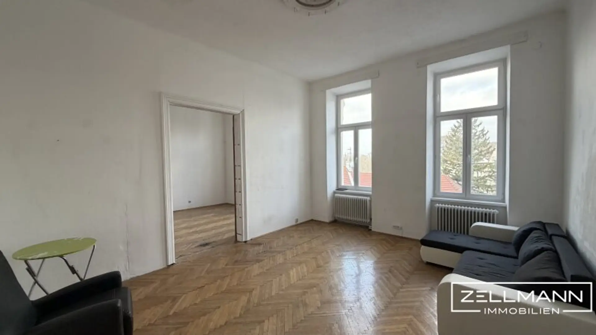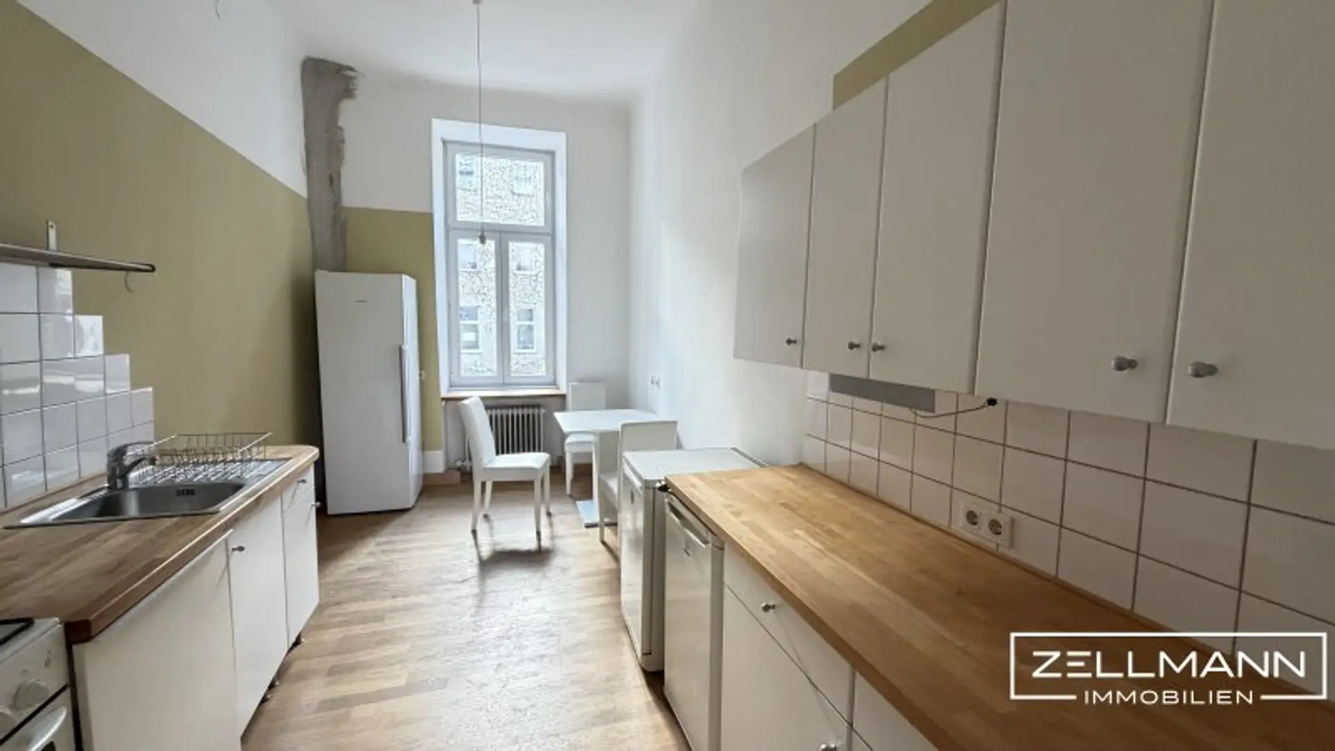 Derzeit wird eines der vier großen Zimmer als eigene Küche genutzt. Dadurch präsentiert sich die Wohnung aktuell als klassische Dreizimmerwohnung mit separater Küche.
