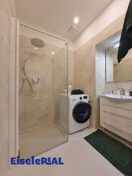 * edles Badezimmer mit Dusche, Fliesen in Marmordesign, Waschmaschine, Waschbecken, Spiegelschrank und Unterverbau