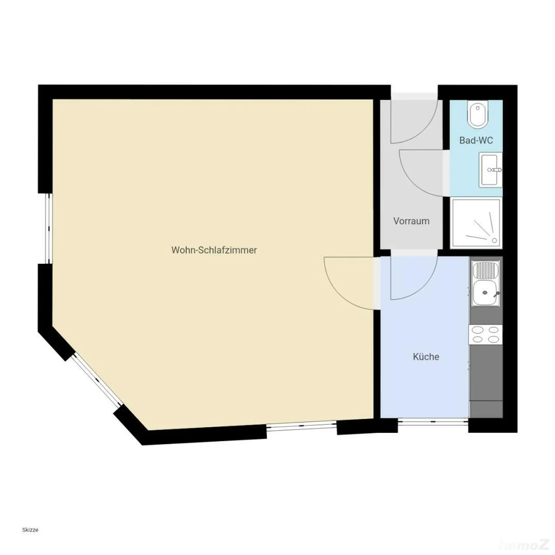 Vorraum, kleines Badezimmer mit WC, Küche mit Essplatzmöglichkeit, Wohnschlafzimmer. Die Beheizung erfolgt mit Infrarotheizelementen und im Badezimmer mit Elektro-Fußbodenheizung. Ein Platz für eine Waschmaschine befindet sich in der Küche.