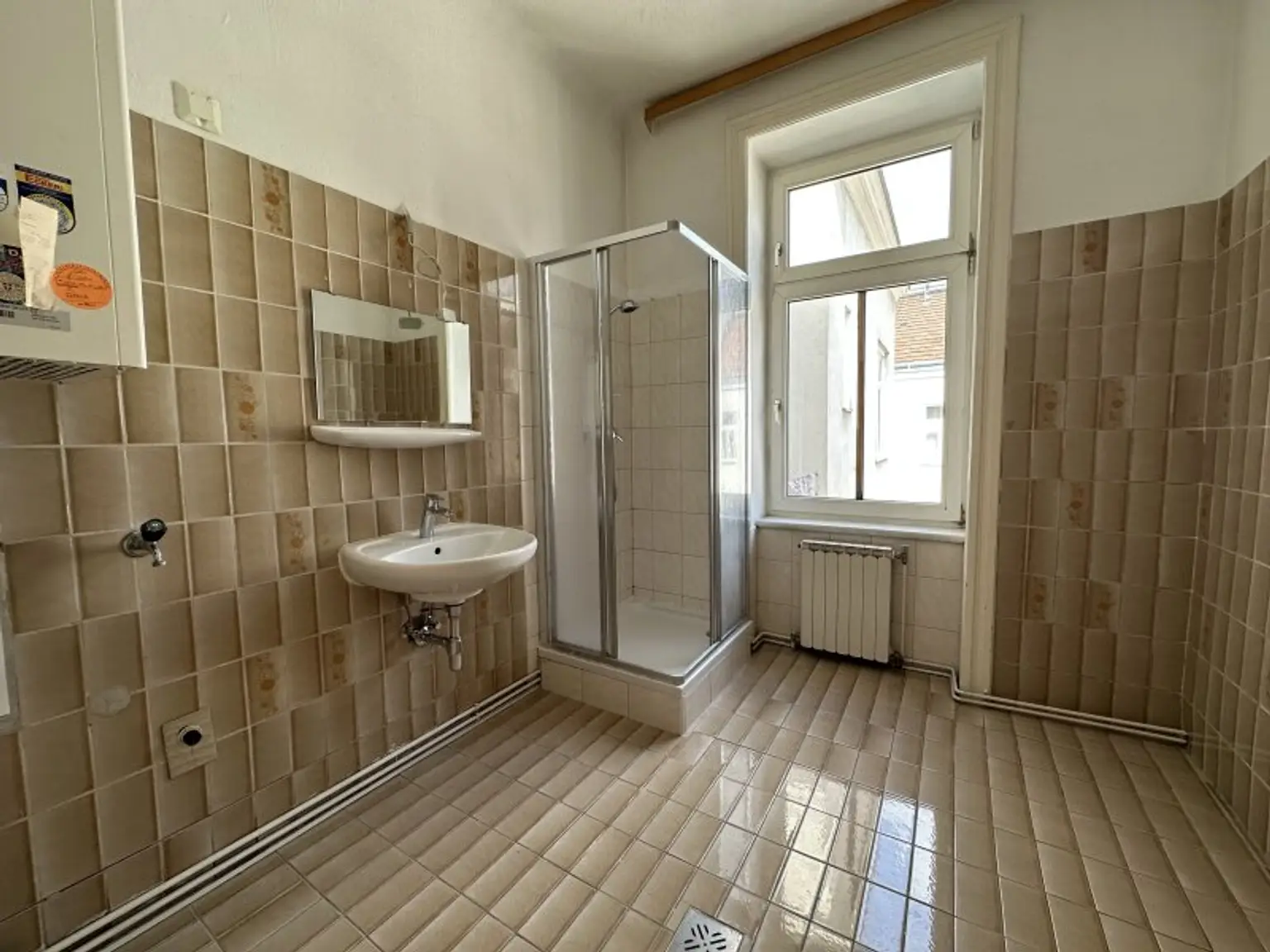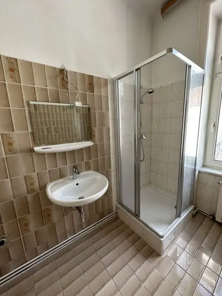 - großes Badezimmer mit Dusche, Fenster und Waschmaschinenanschluss