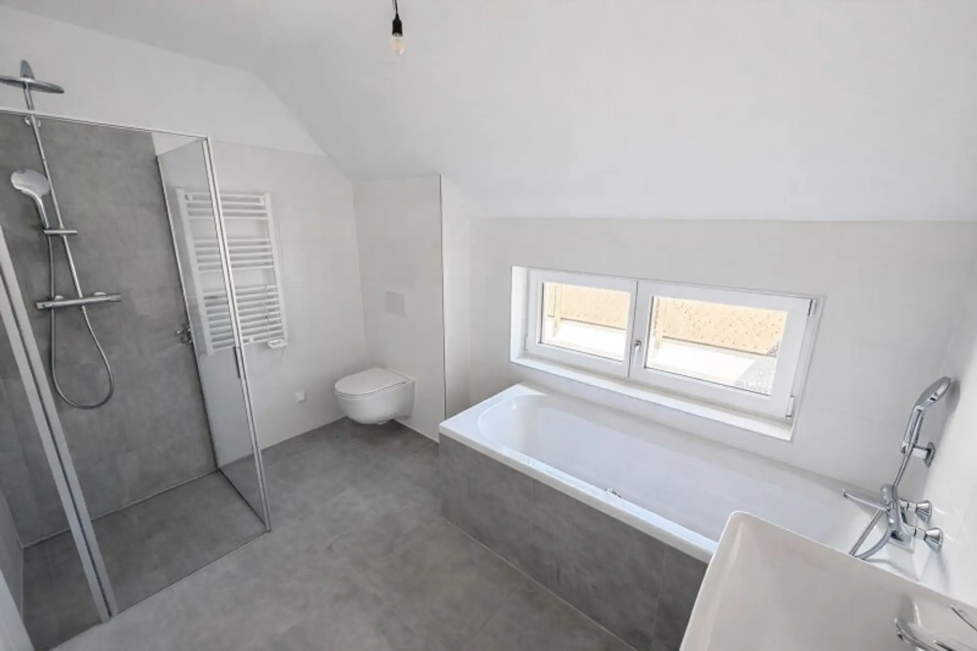 * Badezimmer mit einer Dusche, einer Badewanne, einem Waschbecken, einem Fenster und einem Waschmaschinenanschluss