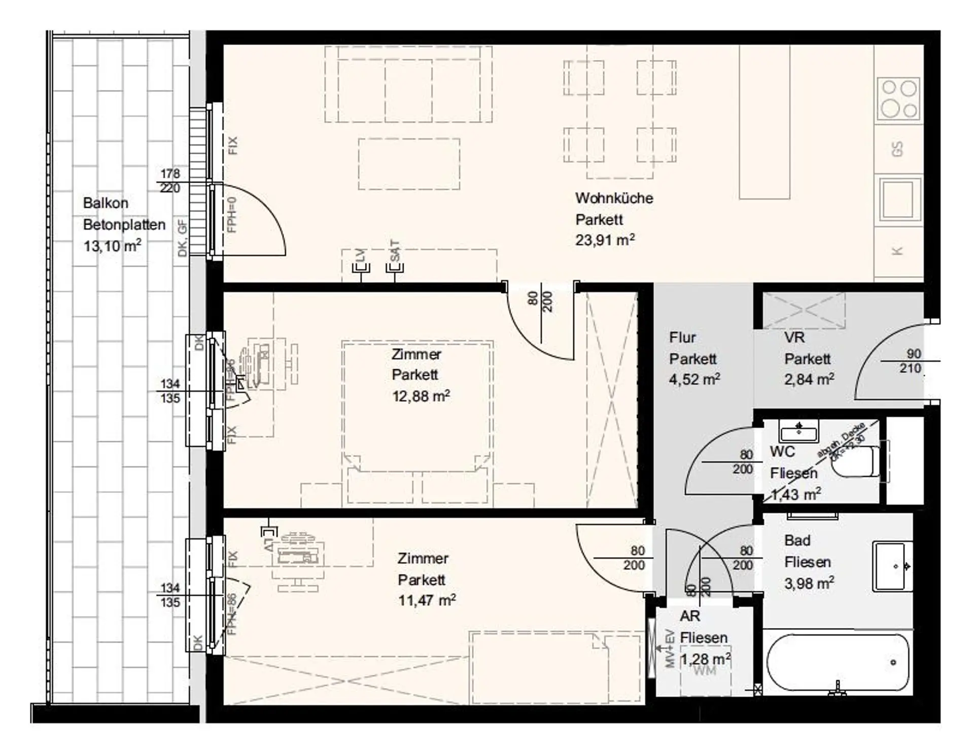 • Deckenkühlung (passive Kühlung im Sommer durch die Betondecke) und Heizung (thermische Heizdecke, per Fernwärme)
