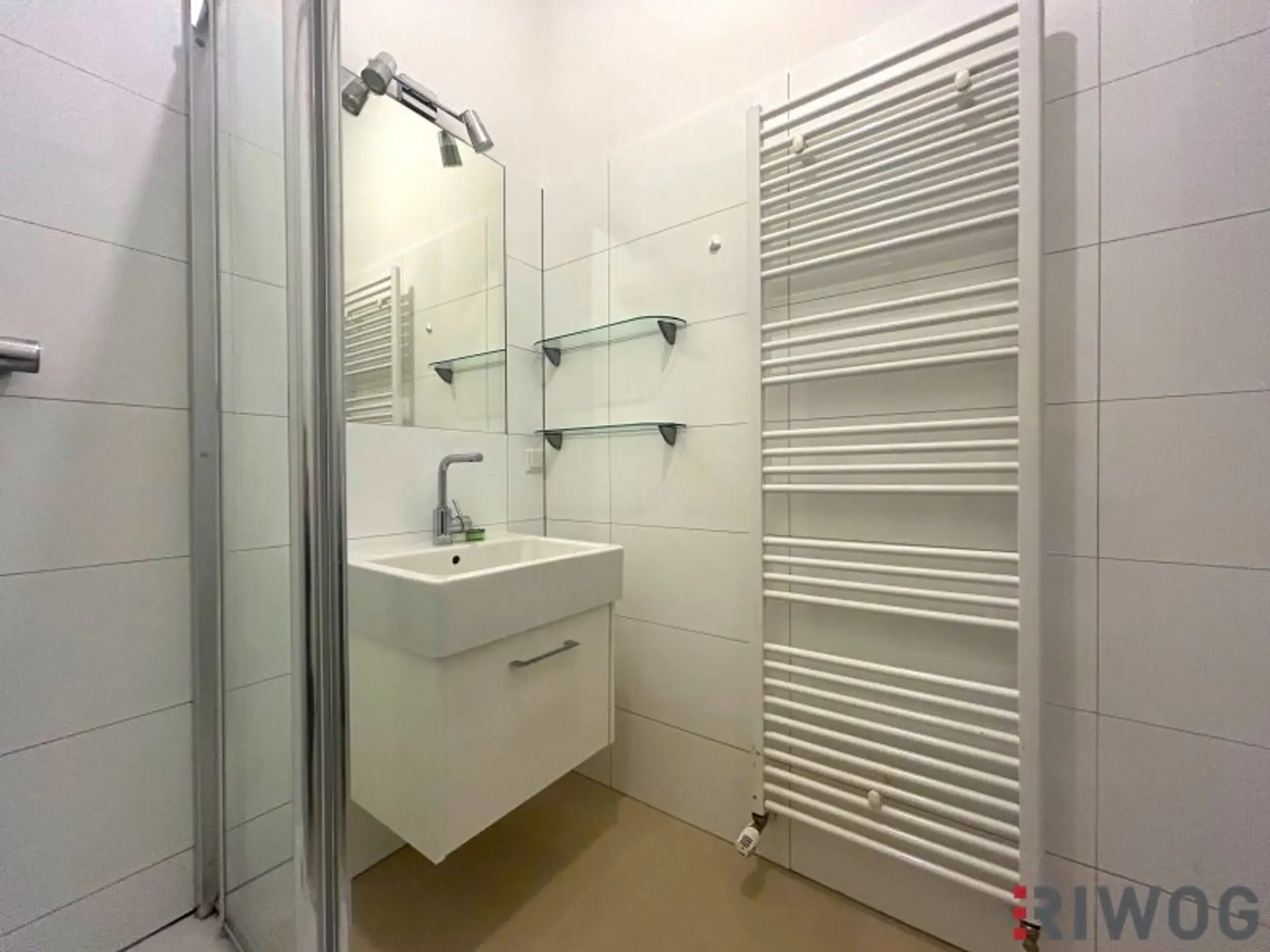 Das Badezimmer ist mit einer Dusche und einem Waschbecken sowie einem Handtuchwärmer ausgestattet.
