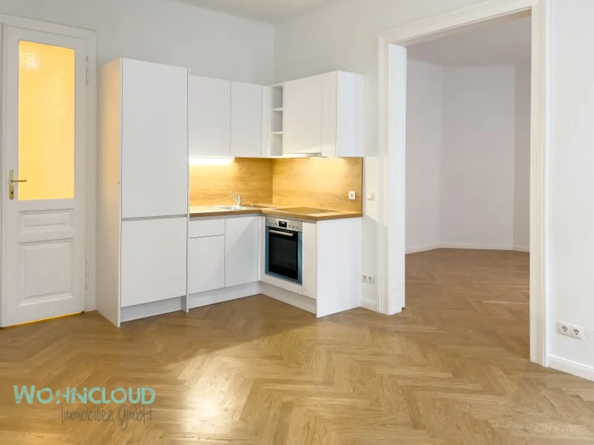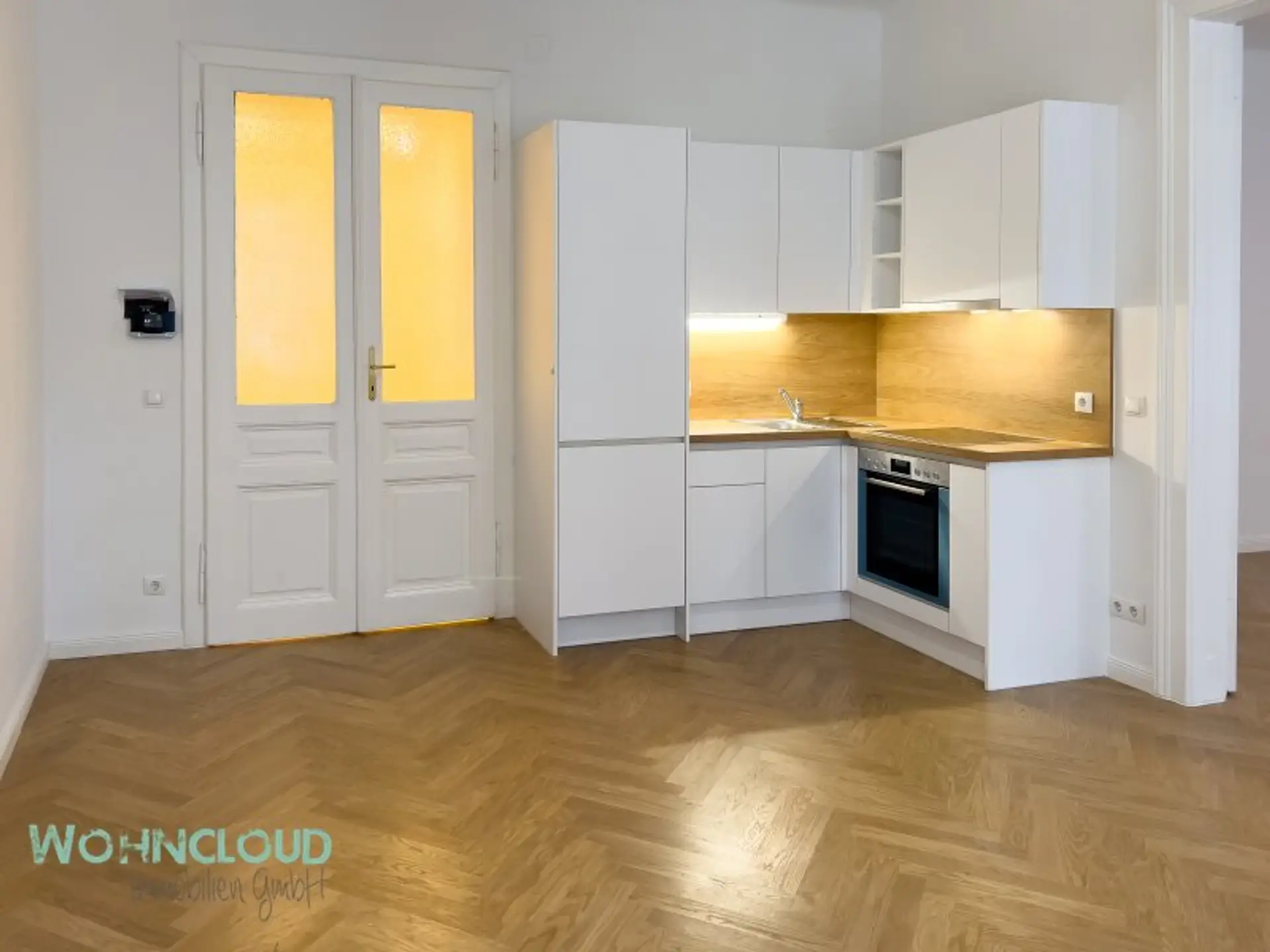 Der einladende Vorraum hat Platz für Garderobe und Schuhschrank und zeigt auch gerne die schöne alte verglaste Doppel-Eingangstüre aus alten künstlerischen Zeiten. Wie ein Raumteiler wirkt die Doppeltür zum Wohnzimmer und gleich in der Ecke links, steht sie, die brandneue Eckküche mit allen Geräten, wie Geschirrspüler, Kühlschrank mit Eisfach und E-Herd, komplett.