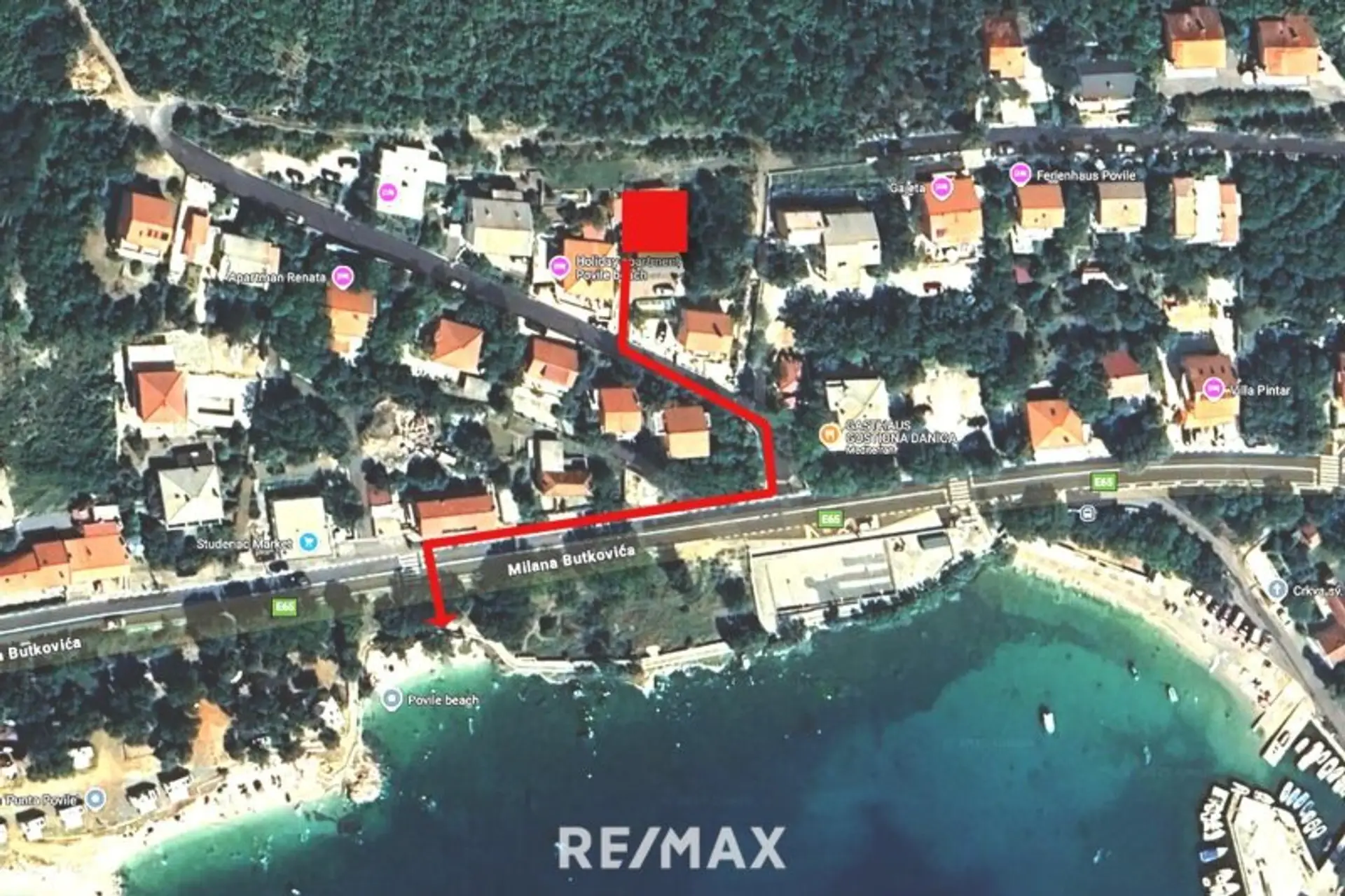 Dieses 2020 fertiggestellte Mehrfamilienhaus befindet sich in einer ruhigen Seitenstraße über dem Povile Beach.