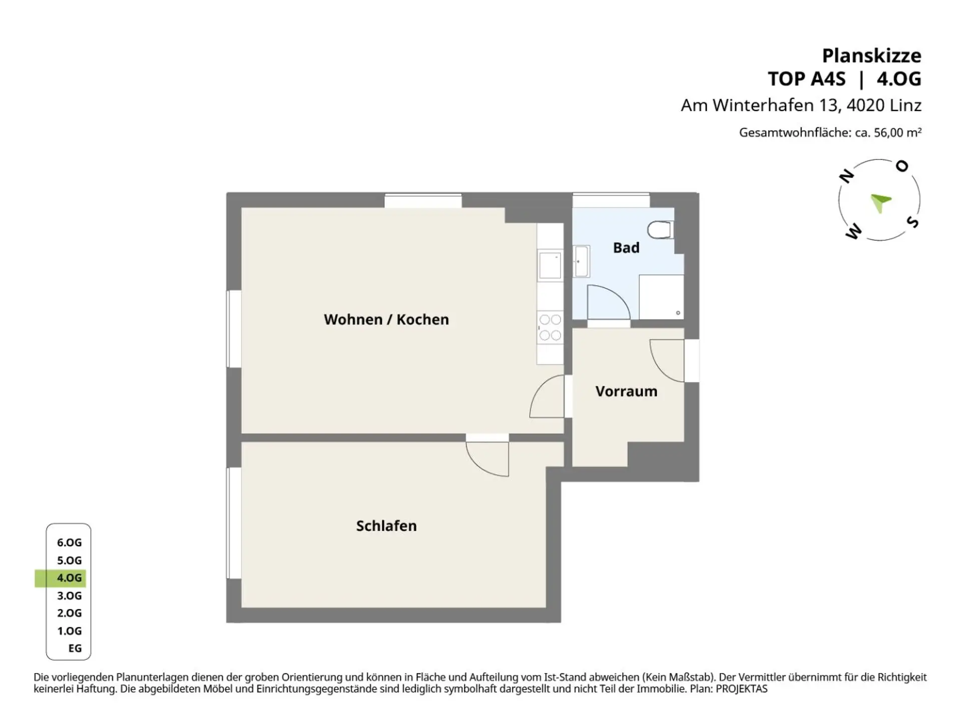 Raumaufteilung der ca. 56 m² Wohnfläche im 4. OG: