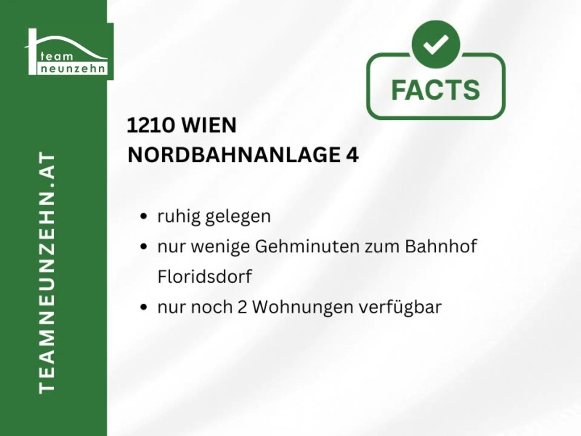 Nur einen kurzen Fußweg von der U6 Station Floridsdorf und der Schnellbahnstation wurden hochwertige Neubauwohnungen errichtet. Hier können Sie herrlich entspannen und Ihre Feierabende und Wochenenden genießen. Die Ausstattung der Innenräume verspricht in jeder Hinsicht einen hervorragenden Qualitäts-Standard.