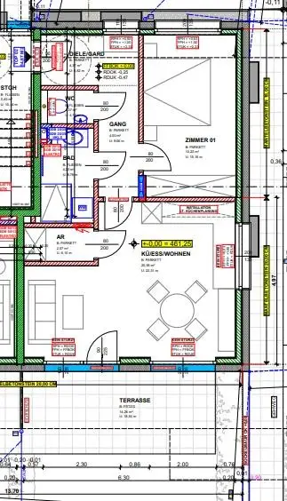 Der helle Wohn- und Essbereich mit südseitiger Ausrichtung öffnet sich zur Terrasse mit Grünblick und lädt zum Entspannen und Verweilen ein. Die maßgefertigte Einbauküche vom Tischler ist harmonisch in den Wohnraum integriert und verbindet Funktionalität mit hochwertigem Design.