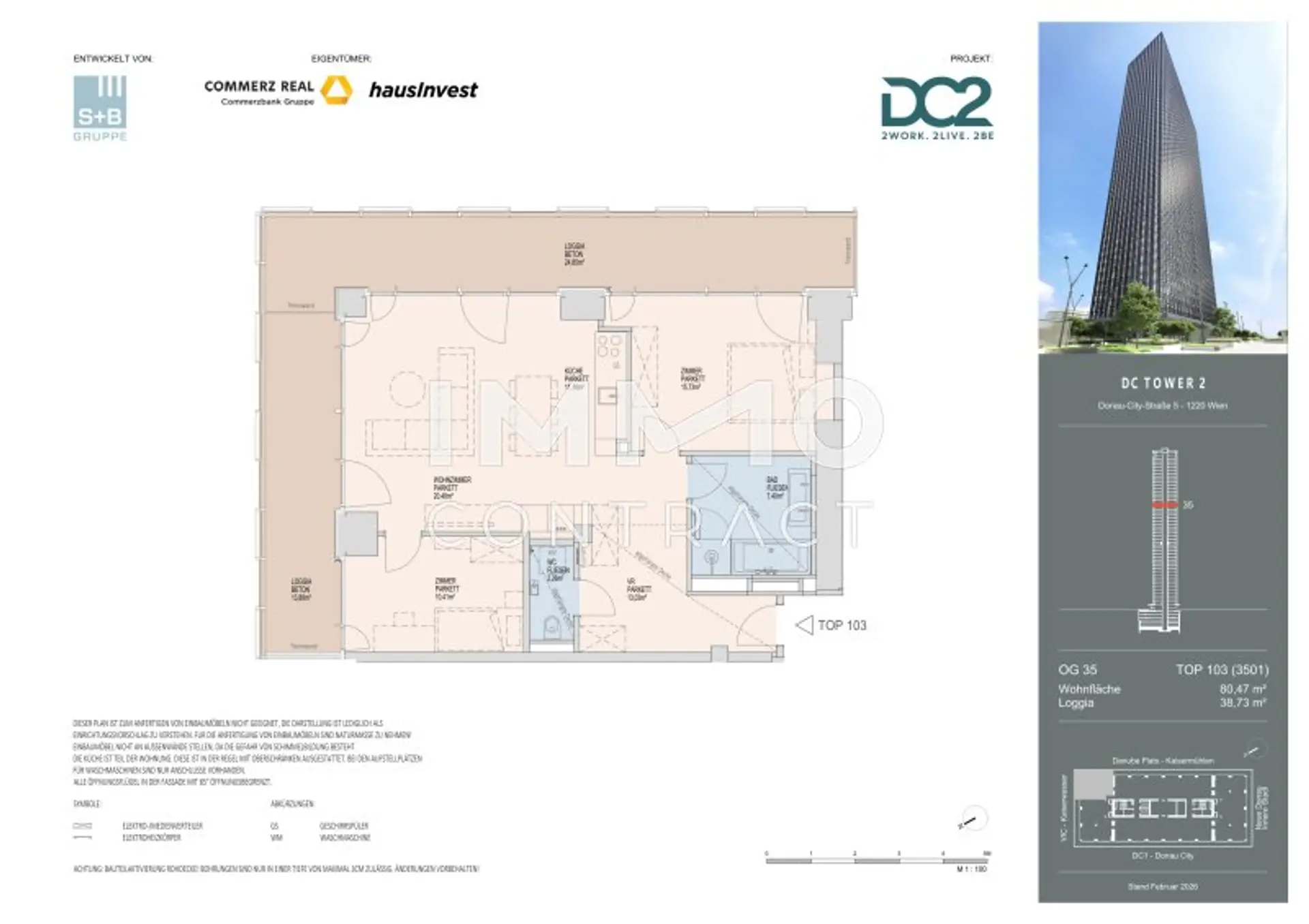 Der DC2 Tower zählt mit 52 Stockwerken und 314 hochwertigen Wohnungen ab dem 32. Obergeschoß zu den spektakulärsten Wohnprojekten des Landes. Die Wohnungsgrößen von ca. 30 bis 260 Quadratmetern bieten ein bewusst vielfältiges Angebot – von intelligent geplanten Einzimmerstudios über komfortable Familienwohnungen bis hin zu großzügigen Fünfzimmer-Maisonettewohnungen. Jede Einheit überzeugt durch durchdachte Grundrisse, hohe Wohnqualität und großzügige Fensterflächen, die den Blick nach außen inszenieren und die Stadt Teil des Wohnraums werden lassen. Loggien, Balkone und Freiräume erweitern den Wohnbereich und machen die beeindruckende Höhe unmittelbar erlebbar.