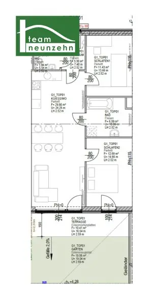 Die 3-Zimmer Wohnung mit ca. 67,75 m² Wohnfläche zzgl. 10,41 m² Terrasse und ca. 19,56 m² Garten liegt im Erdgeschoss und teilt sich wie folgt auf:
