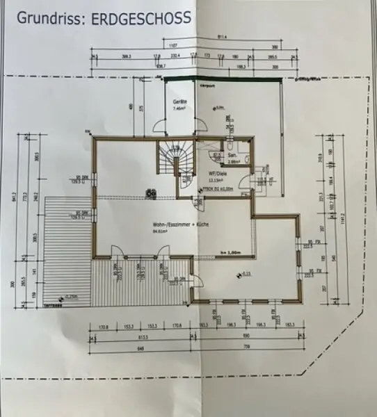 Man betritt das Grundstück über einen großzügig gestalteten Vorplatz, auf dem vier Stellplätze zur Verfügung stehen, darunter ein überdachter Carport. Die ausgedehnte Fläche bietet bequem Platz für Gäste- und Familienfahrzeuge.