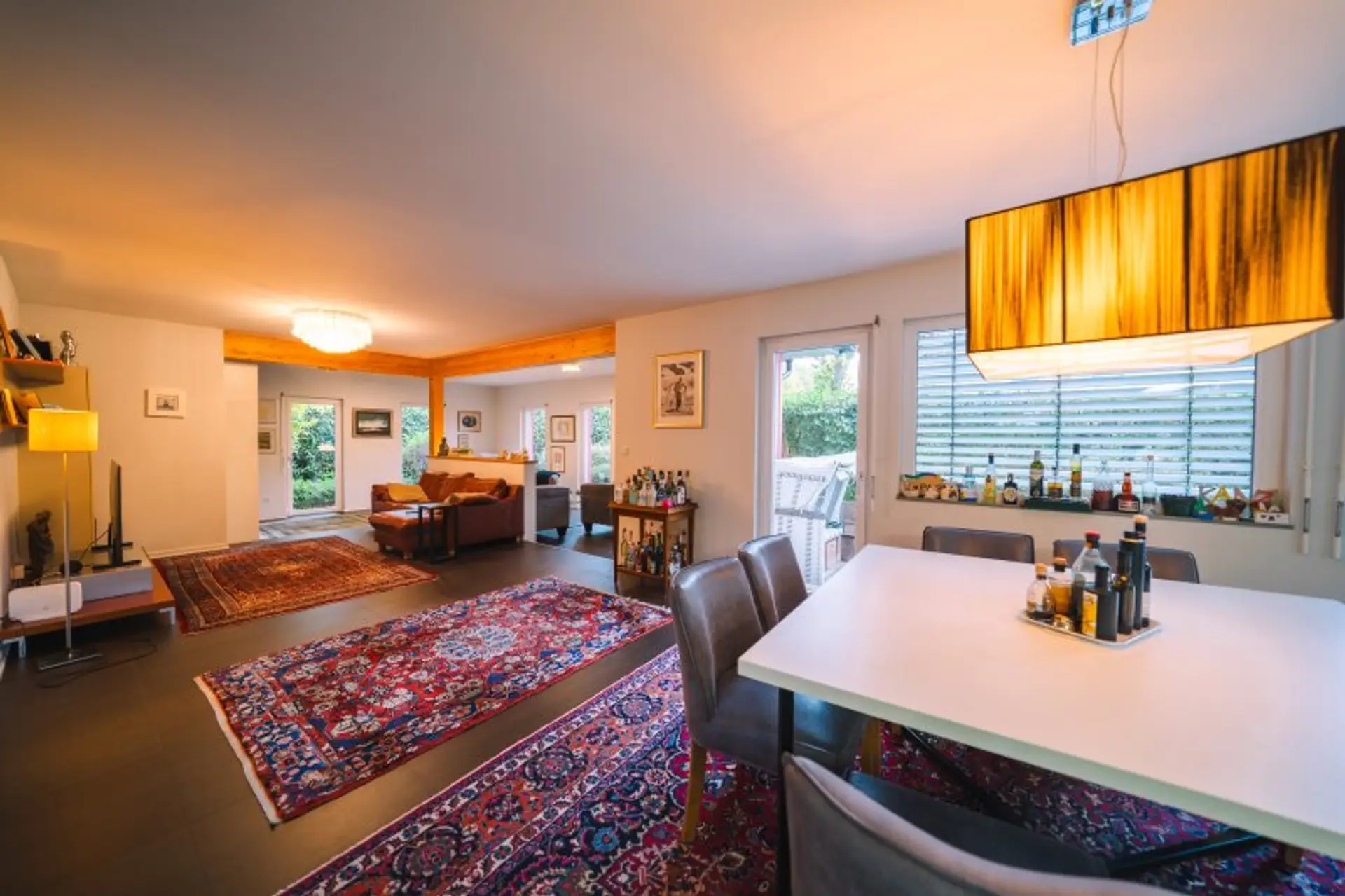 Der weiträumige, lichtdurchflutete Wohn- und Essbereich vermittelt dank seiner offenen Gestaltung ein besonders angenehmes Wohngefühl. Große Fensterflächen schaffen eine helle und freundliche Atmosphäre und bieten zudem direkten Zugang zur Terrasse – ideal für entspannte Stunden im Freien oder gesellige Abende mit Familie und Freunden.