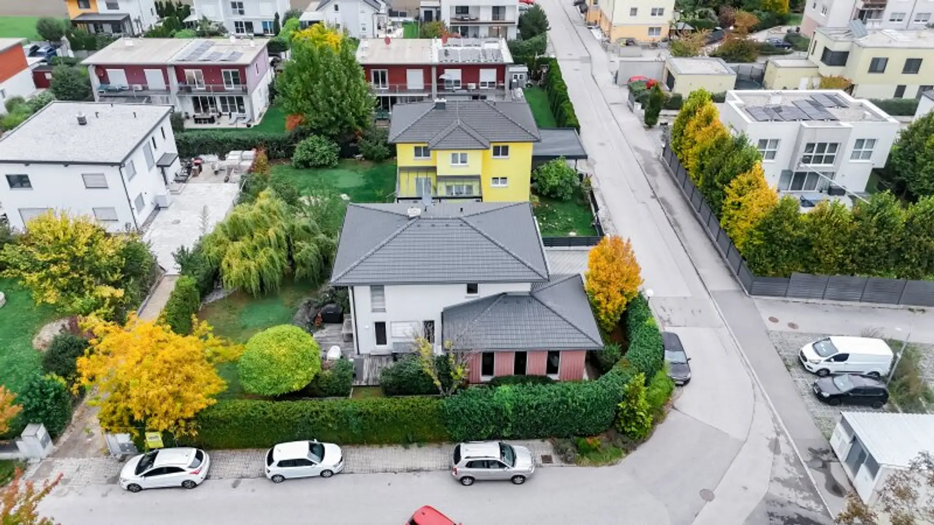 Man betritt das Grundstück über einen großzügig gestalteten Vorplatz, auf dem vier Stellplätze zur Verfügung stehen, darunter ein überdachter Carport. Die ausgedehnte Fläche bietet bequem Platz für Gäste- und Familienfahrzeuge.