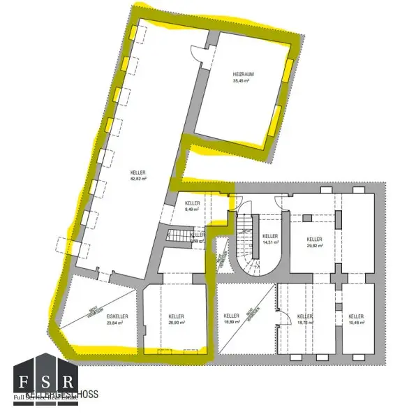 Das Lokal verfügt über rd. 350m² Nutzfläche - davon ca. 172 m² im Erdgeschoss und 178 m² im Keller mit Eiskeller, Heizraum Lager etc.