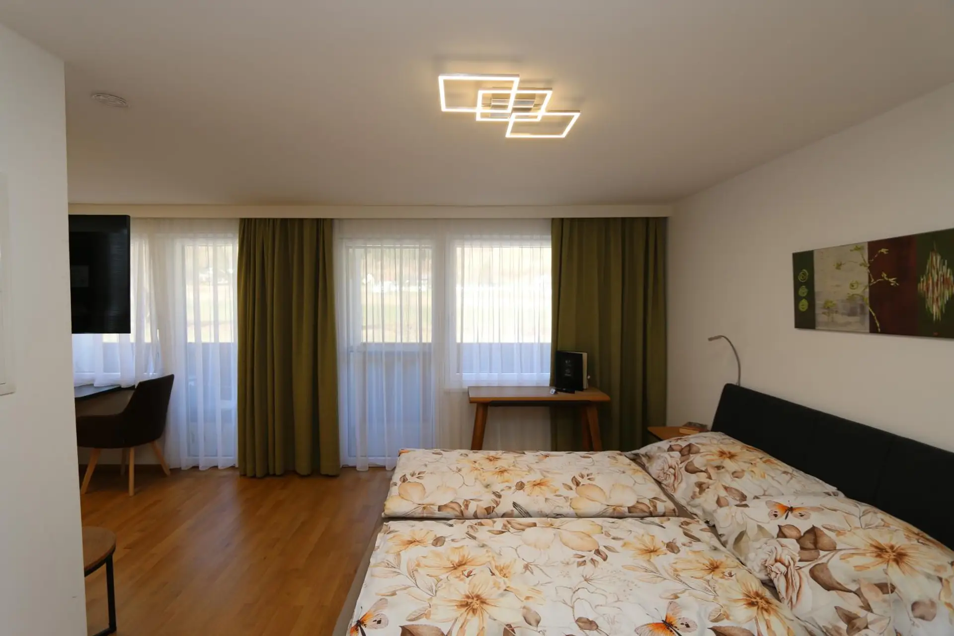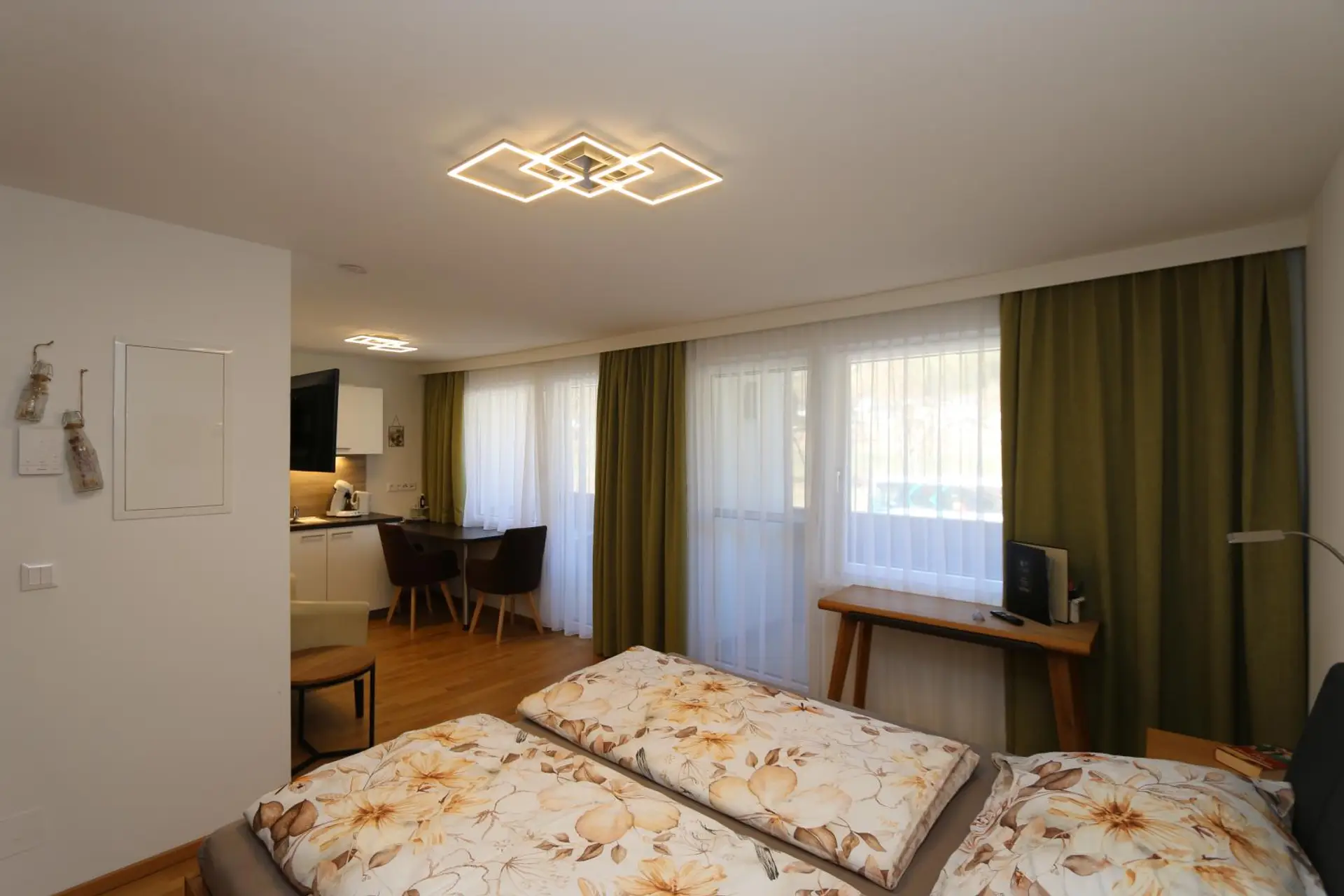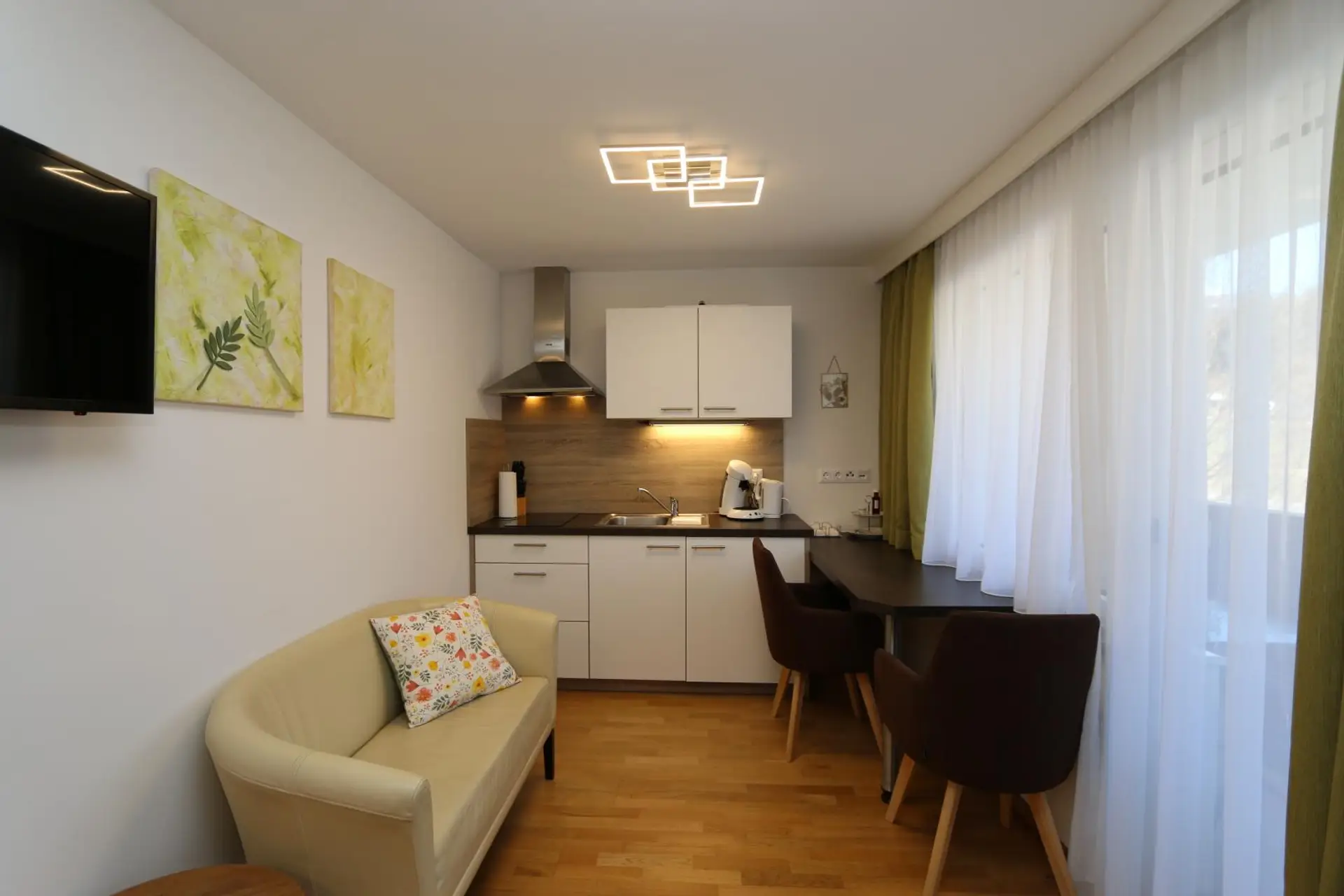 * Raumaufteilung: Wohn-/Schlafbereich mit Küchenzeile, Badezimmer mit Dusche und WC, 2 Loggias