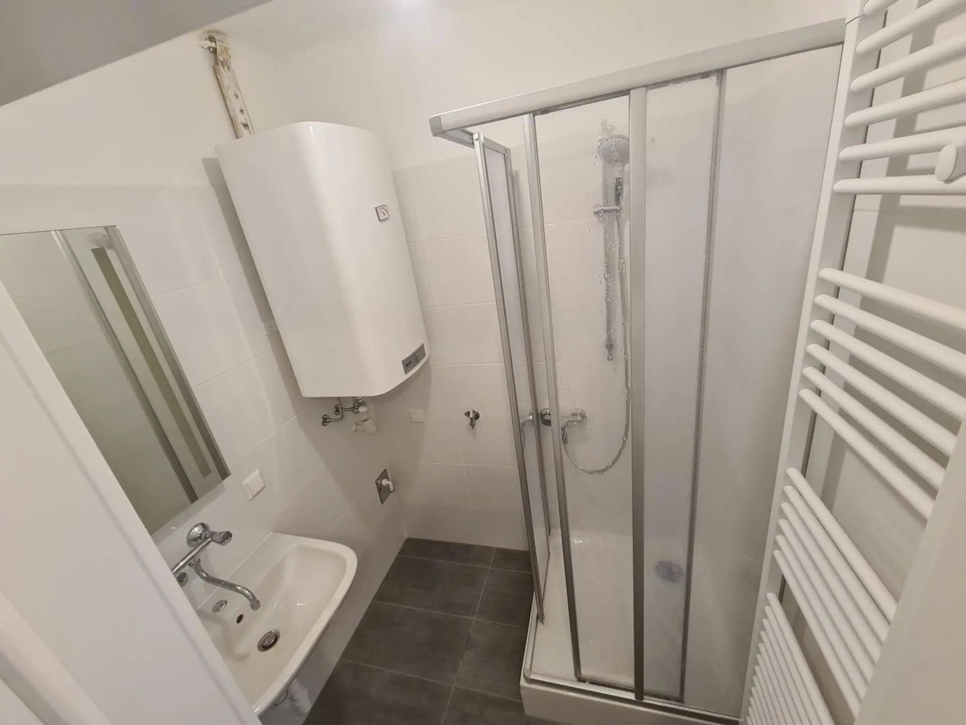- Badezimmer mit Dusche und Waschmaschinenanschluss