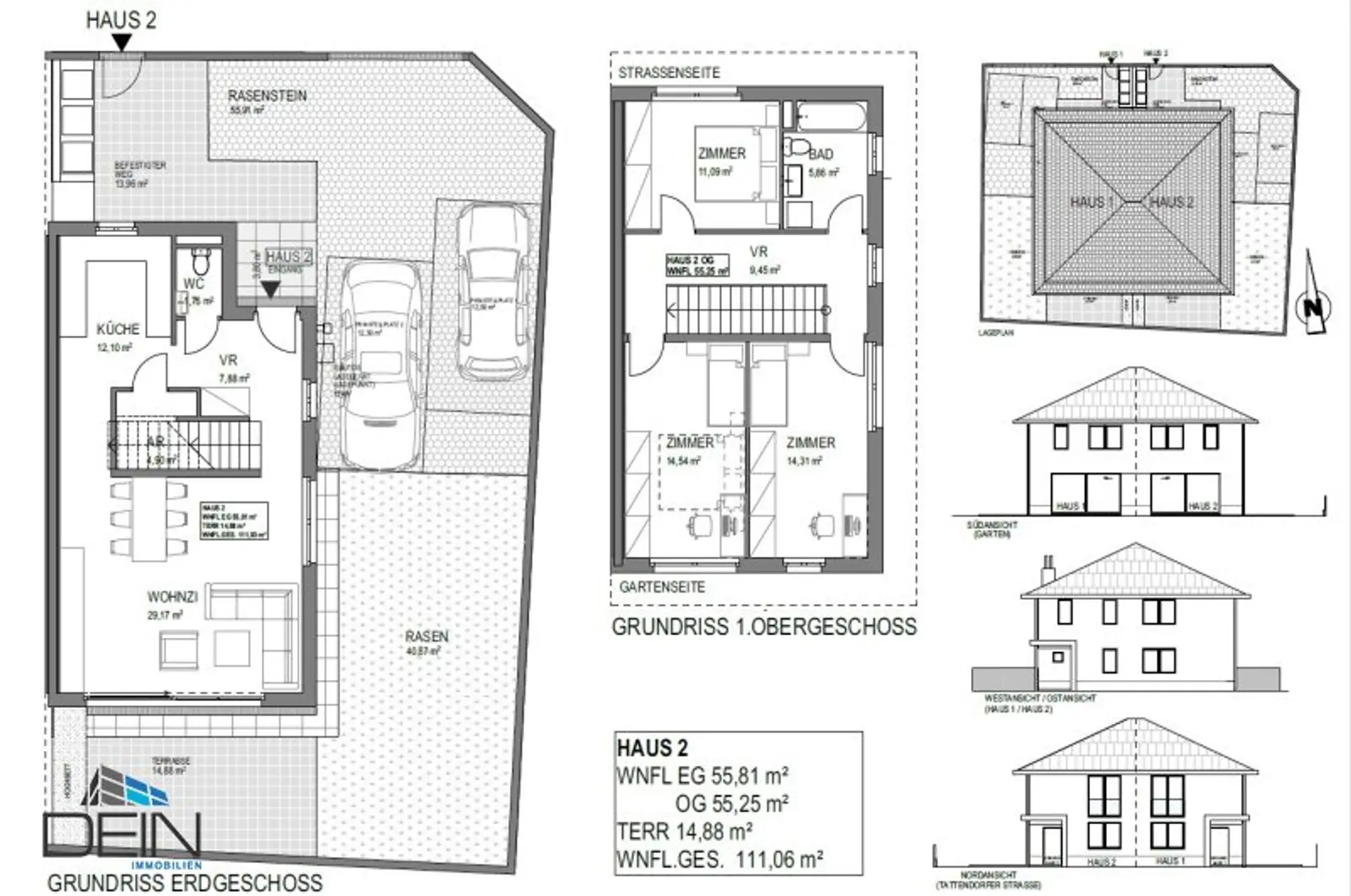 Haus 2: 4 Zimmer, ca. 111,06 m² WNFL, ca. 96,36 m² Terrasse/Garten/befestigter Vorgarten, 2 PKW Stellplätze, ANLEGER EURO 510.000,00 zzgl. 20 % USt oder EIGENNUTZER EURO 550.000,00